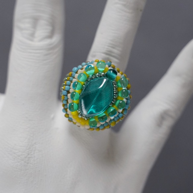スカーフリングにも おしゃべりな指輪213 フリーサイズ ビーズ刺繍のリング グリーン ブルー おおぶりリング