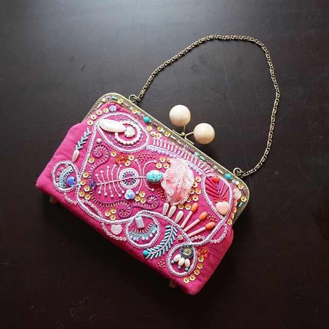 とっておきのがま口バッグ ガーゼ ビーズ刺繍 ピンク ビビッド ミニ 2