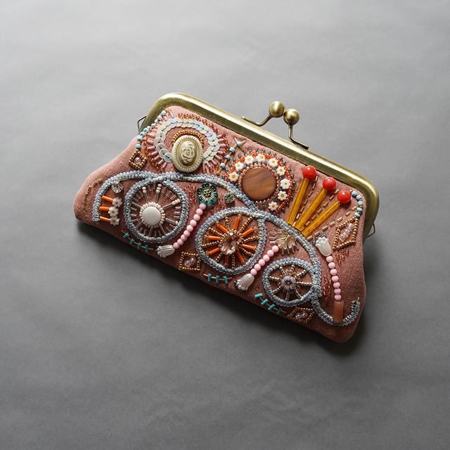 ビーズ刺繍のがま口 4 ピンク オレンジ マチなしポーチ