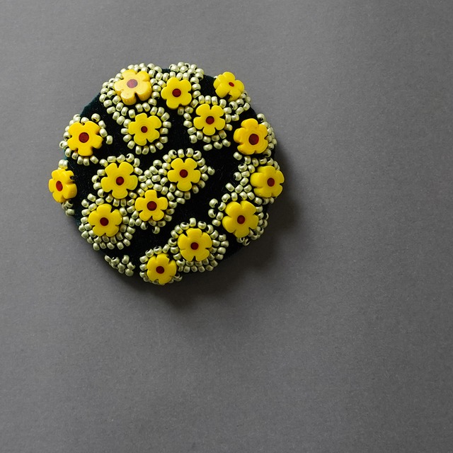 ビーズ刺繍をしようと、竹ビーズをマットにたくさん出した時、ランダムに散らばった様子が面白く目が離せなくなりました。 その様子をそのままブローチに仕立てました。 つやつやしていたり、きらきらしていたり、マットだったり…ものによって表情が違います。 なんだかごま団子のようなチャーミングなブローチに仕上がりました。 細かなビーズをたくさん使用していますがとても軽く、裏から接着剤で留めてあるため取れにくくなっています。 ひとつひとつ丁寧に手仕事で仕上げた1点物です。 飾り部分のサイズ:直径約5センチ 素材:ビーズ、サテン等 原産国:日本 ケースは付いていません。小さなオーガンジーの袋に入れてお届けします。 取り扱い注意:素材の特性上摩擦や雨により生地が毛羽立ったりビーズが退色したりする場合があります。 複数のご注文の際、実際の送料と若干の誤差が生じてしまう場合がございます。予めご了承ください。 他のサイトでも作品の販売をしております。注文が重複してしまった場合、先にご注文いただいたお客様を優先させていただいております。ご理解のほどよろしくお願いいたします。 *禁止事項* 写真や文章の無断での転載・作品の転売(パーツとしての使用も含む)を禁止します。