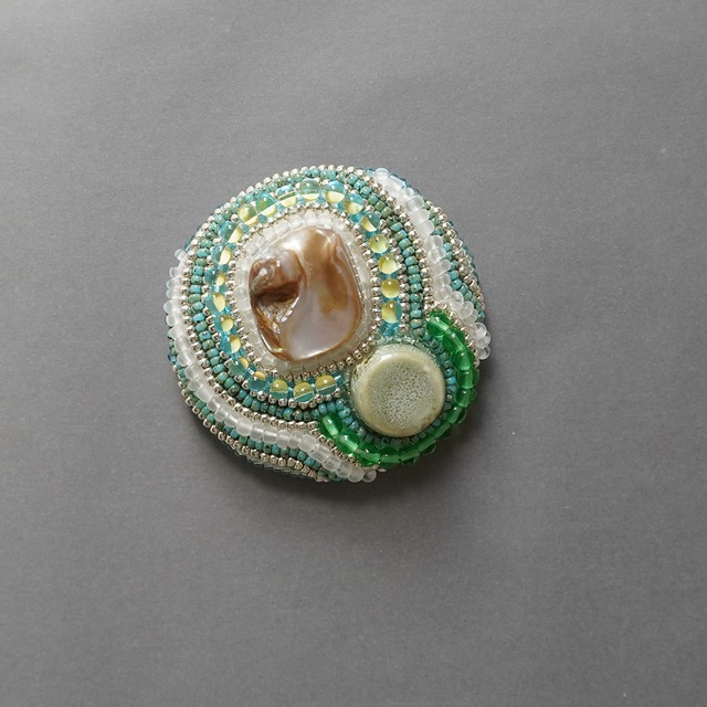 おしゃべりなブローチ おおぶり 9 ビーズ刺繍のブローチ グリーン シェル カラフル 個性的 一点もの クリスマス