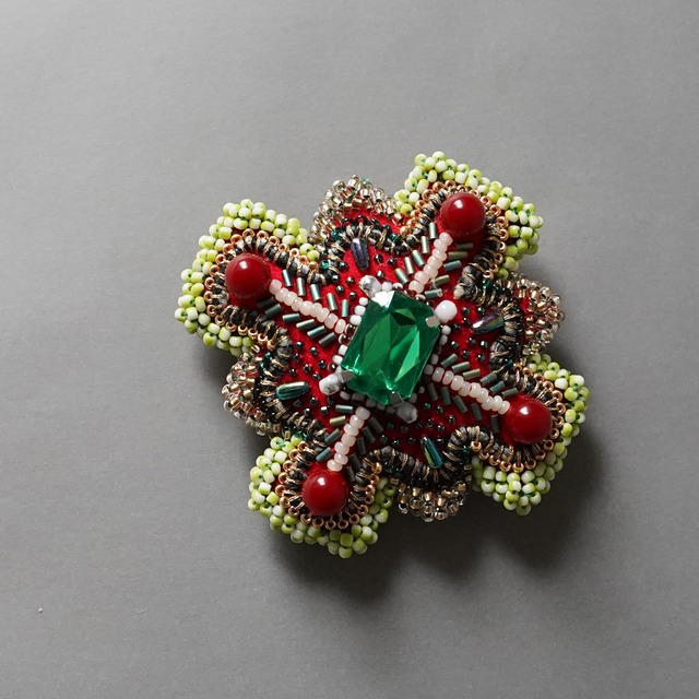 ブローチ ばらまく 7 おおぶり ビーズ刺繍のブローチ グリーン レッド 個性的 一点もの クリスマス