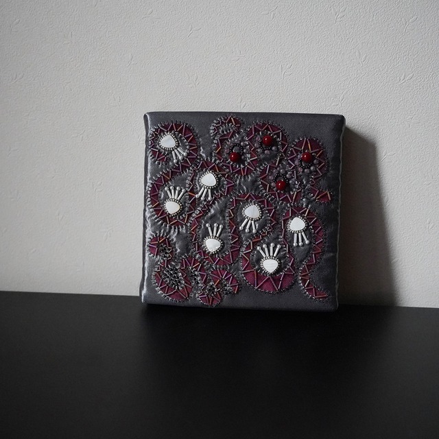 繰り返すことは退屈だったり美しかったり。 ループをテーマに刺繍しました。 ファブリックパネルです。 どこにも無い、誰とも被らない完全一点ものです。 ひとつひとつ丁寧に手仕事で仕上げています。 素材:サテン、ビーズ、金糸、貝ビーズ等 原産国:日本 全体サイズ:約15×15センチ ※箱は付いていません。プチプチ等の梱包材で丁寧に包んでお届けします。 取り扱い注意:素材の特性上摩擦や雨により生地が毛羽立ったりビーズが退色したりする場合があります。 他のサイトでも作品の販売をしております。注文が重複してしまった場合、先にご注文いただいたお客様を優先させていただいております。ご理解のほどよろしくお願いいたします。