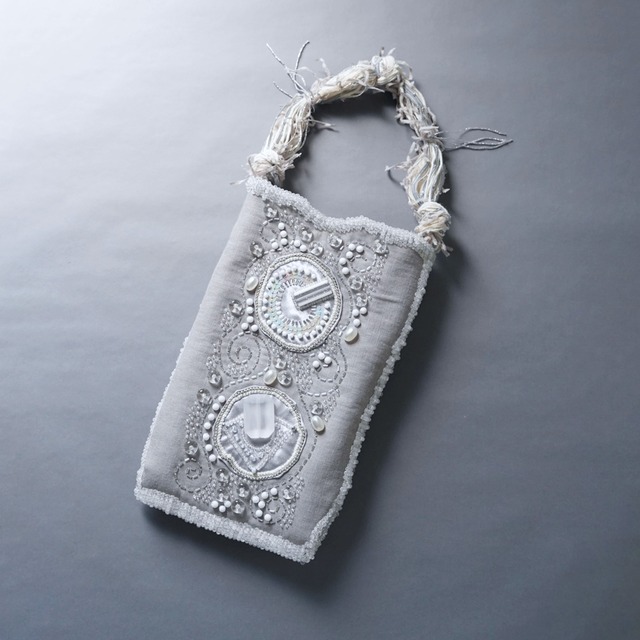 訳あり品 とっておきのハンドバッグ2 縦長 両面刺繍 ビーズ刺繍 グレー シルバー ホワイト 長財布 一点もの 個性的