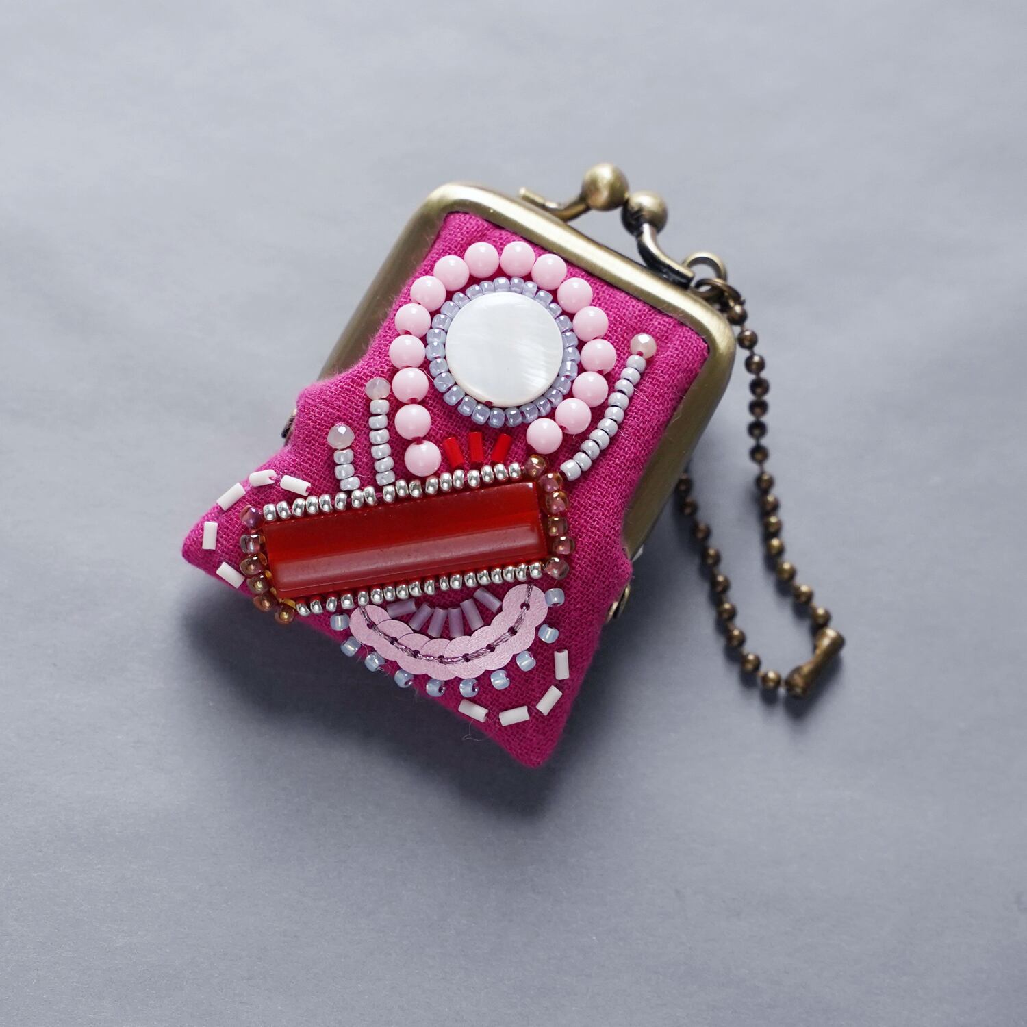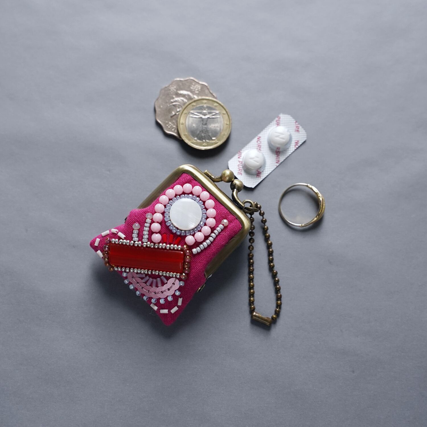 ネックレスにも、バッグチャームにも、小さな小さなビーズ刺繍のがま口 35 ピンク プレゼント アクセサリーケース