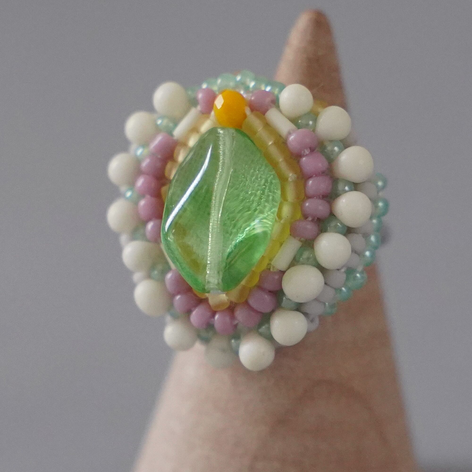 スカーフリングにも おしゃべりな指輪212 フリーサイズ ビーズ刺繍のリング グリーン スプリングカラー おおぶりリング