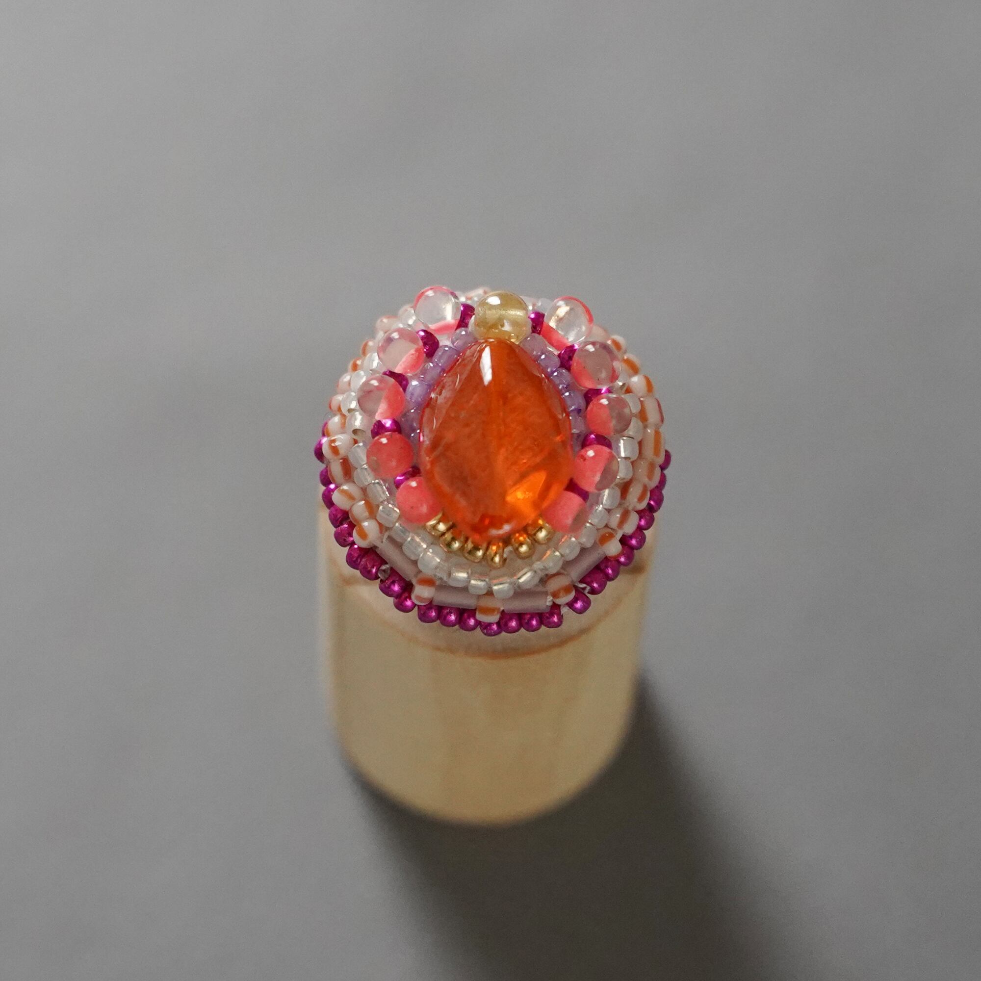 スカーフリングにも おしゃべりな指輪215 フリーサイズ ビーズ刺繍のリング オレンジ ビビッド おおぶりリング