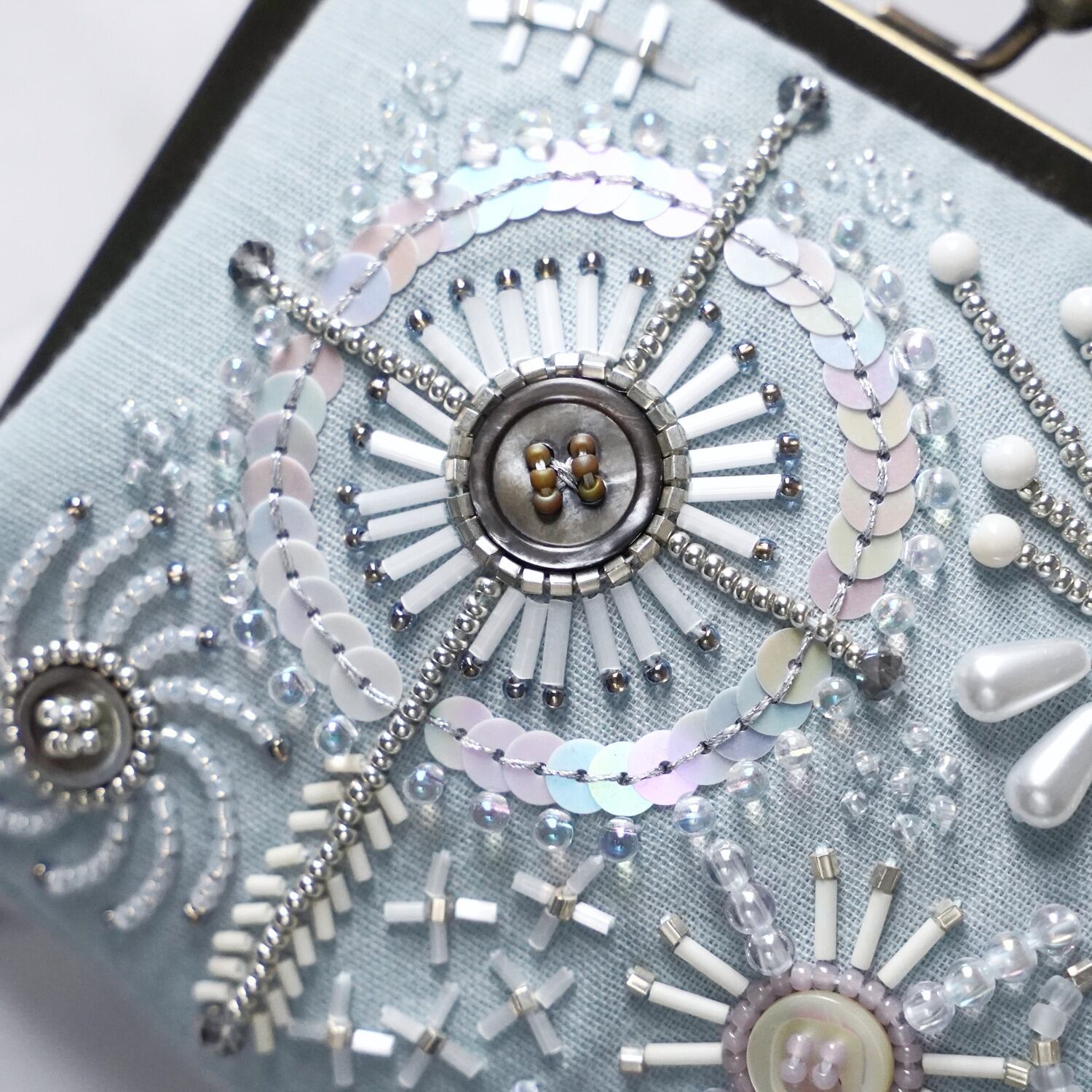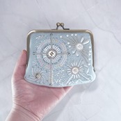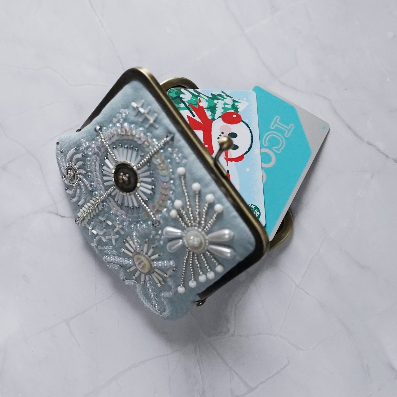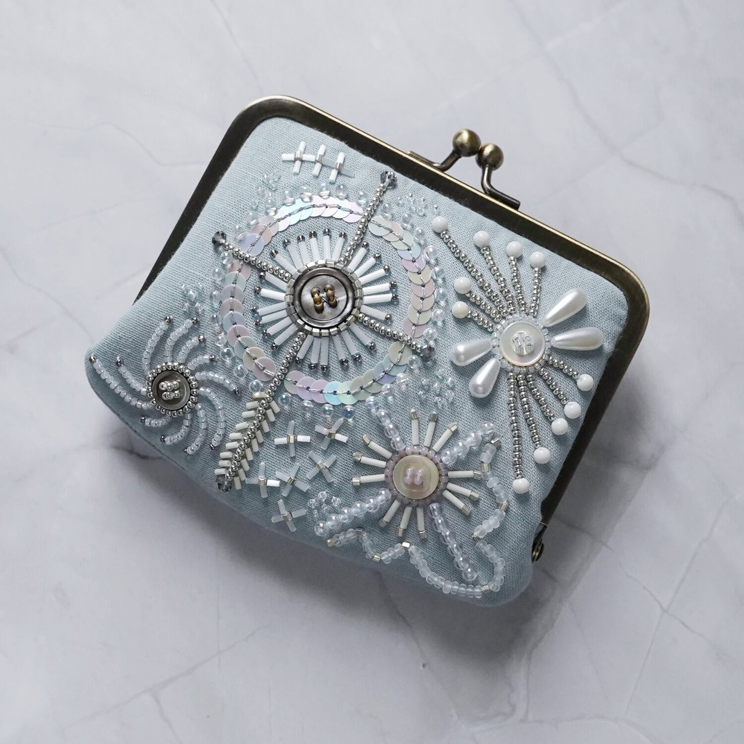 優しい水色の布地に、繊細なビーズ刺繍をあしらった小さながま口ポーチです。