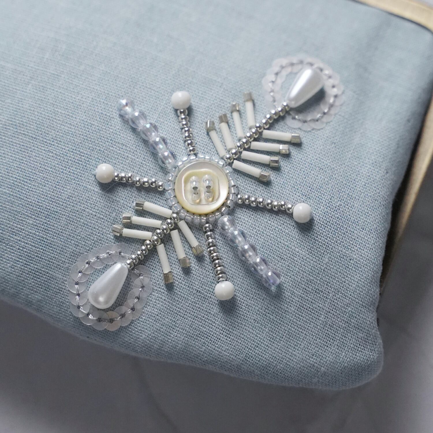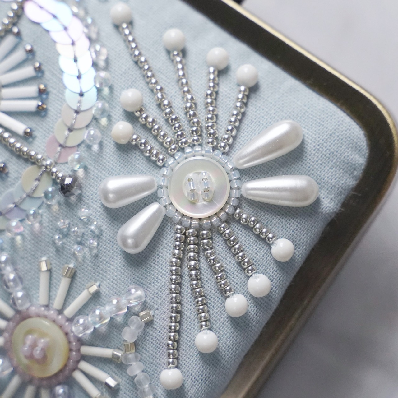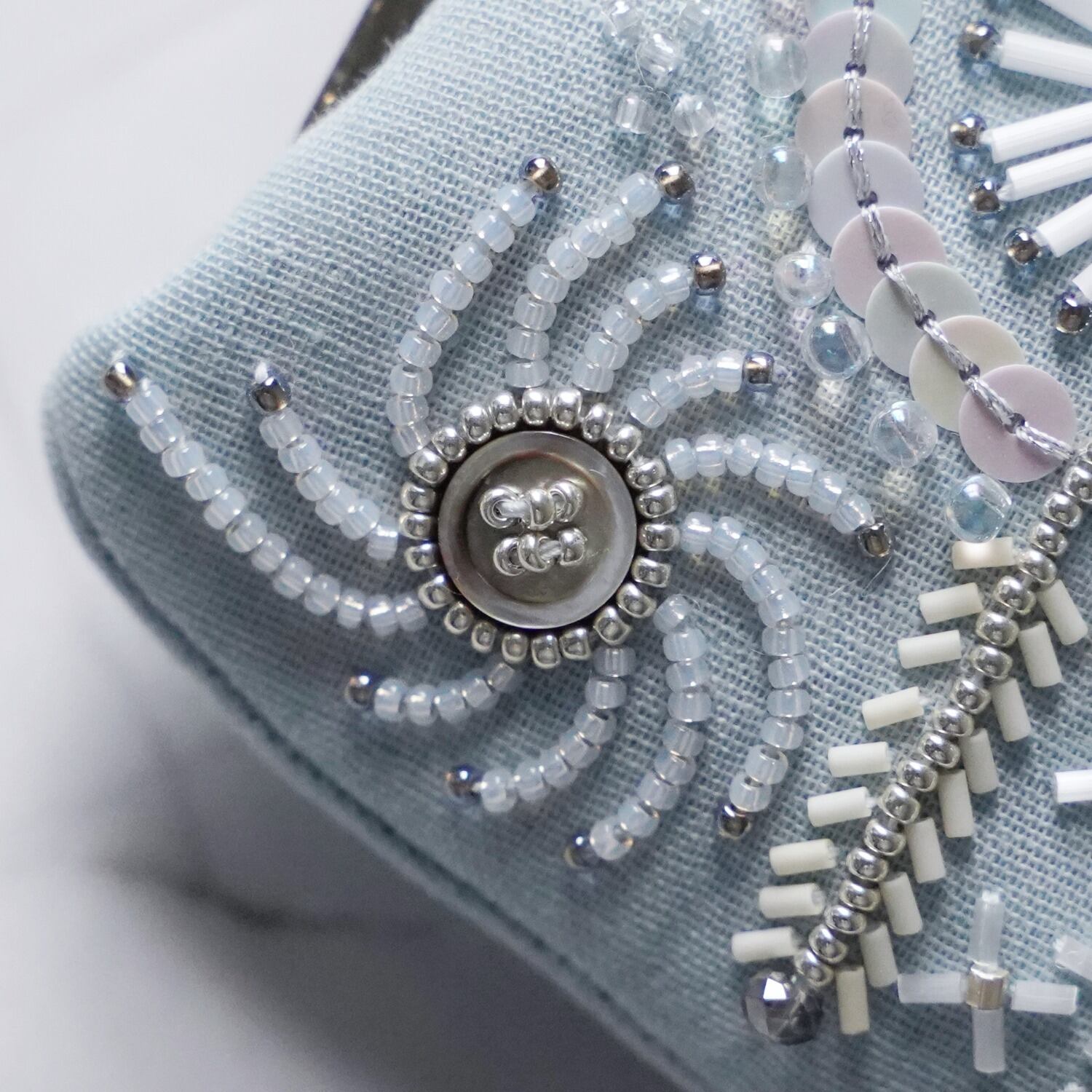 優しい水色の布地に、繊細なビーズ刺繍をあしらった小さながま口ポーチです。