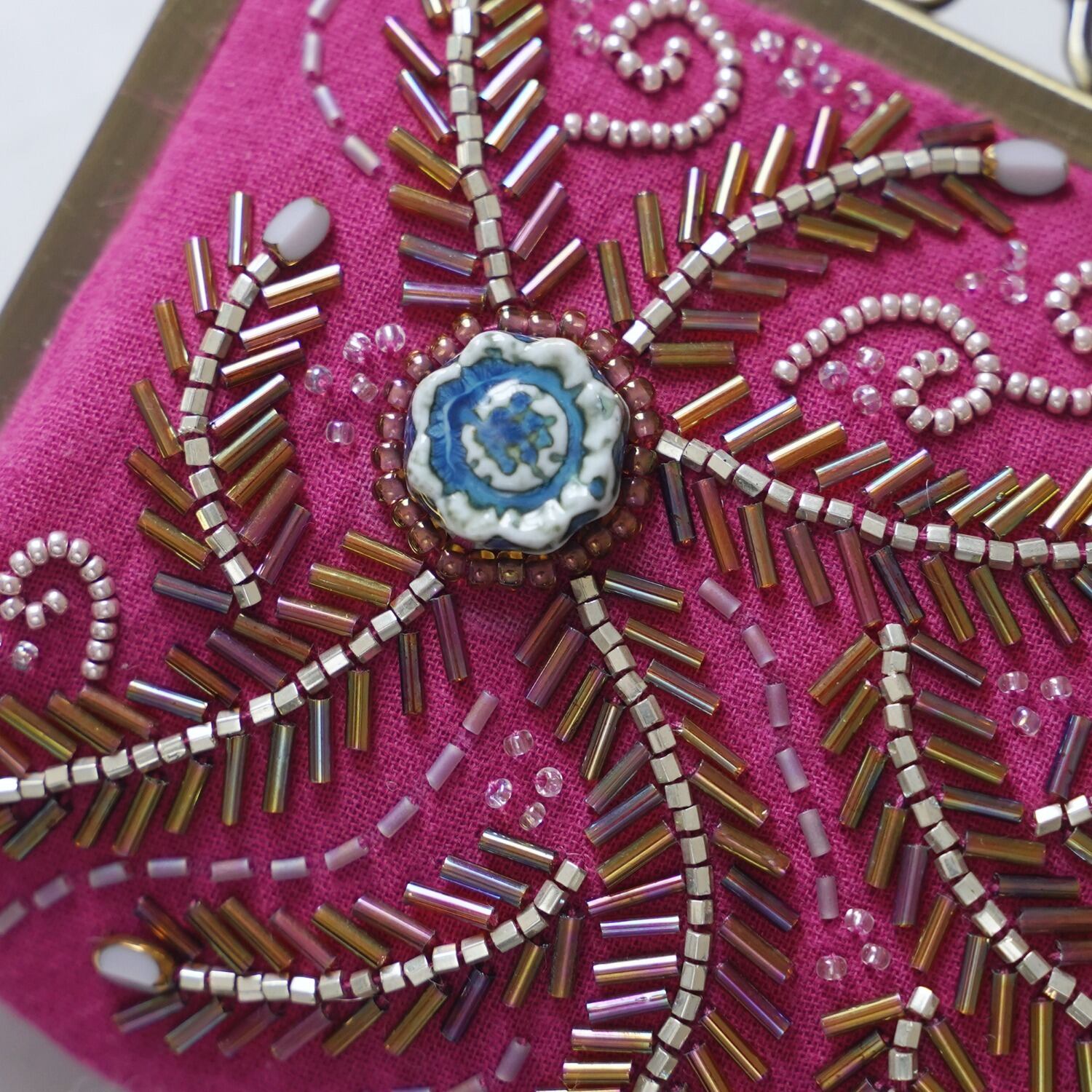 ビビッドなピンクの布地に、繊細なビーズ刺繍をあしらった小さながま口ポーチです。