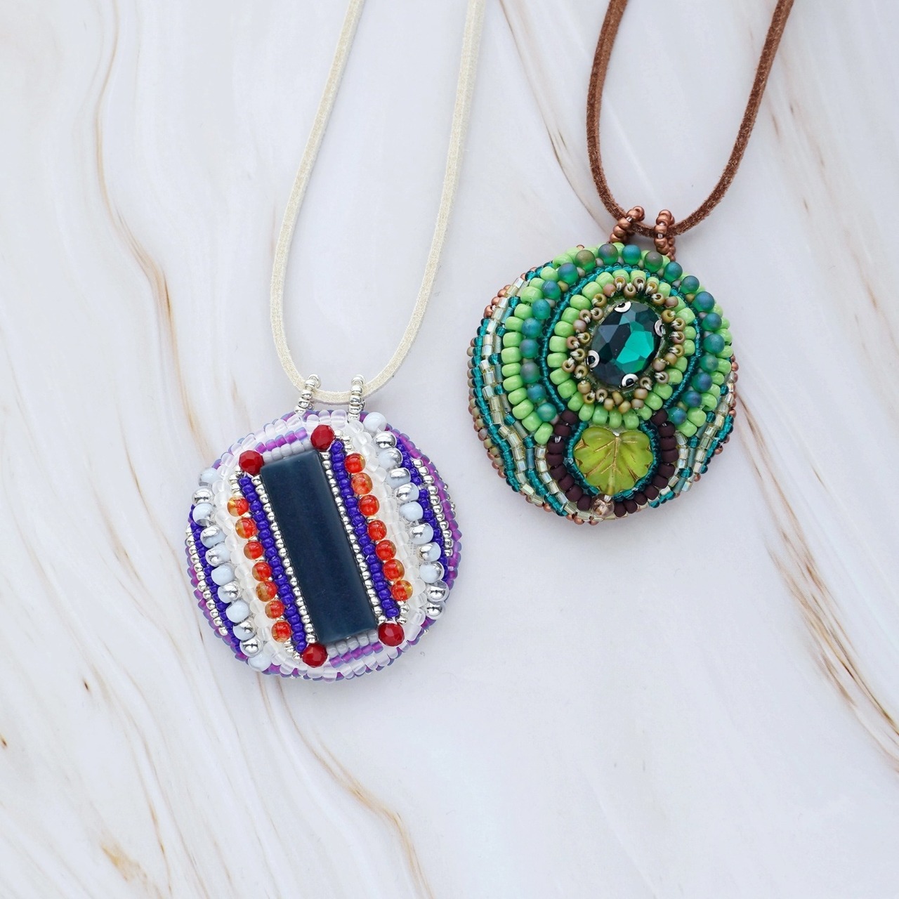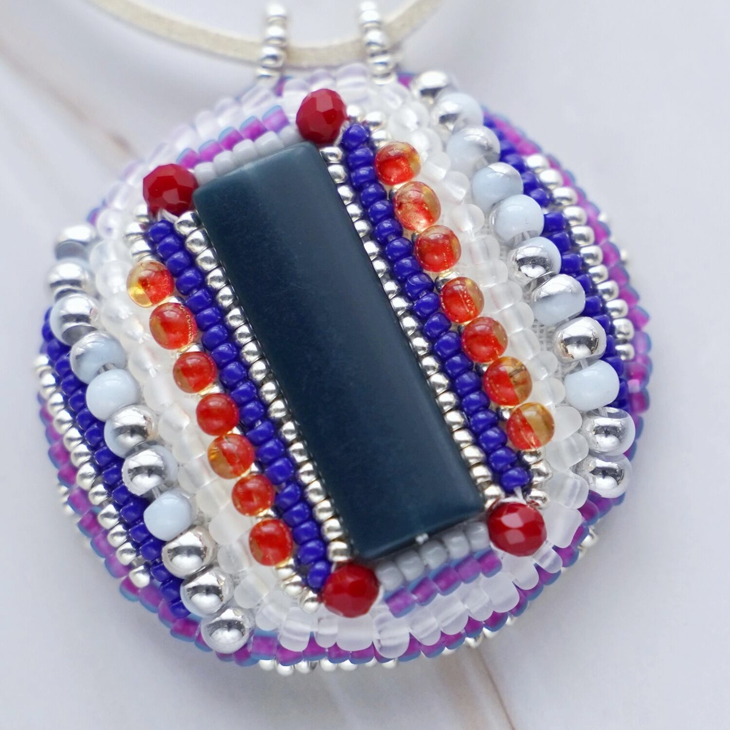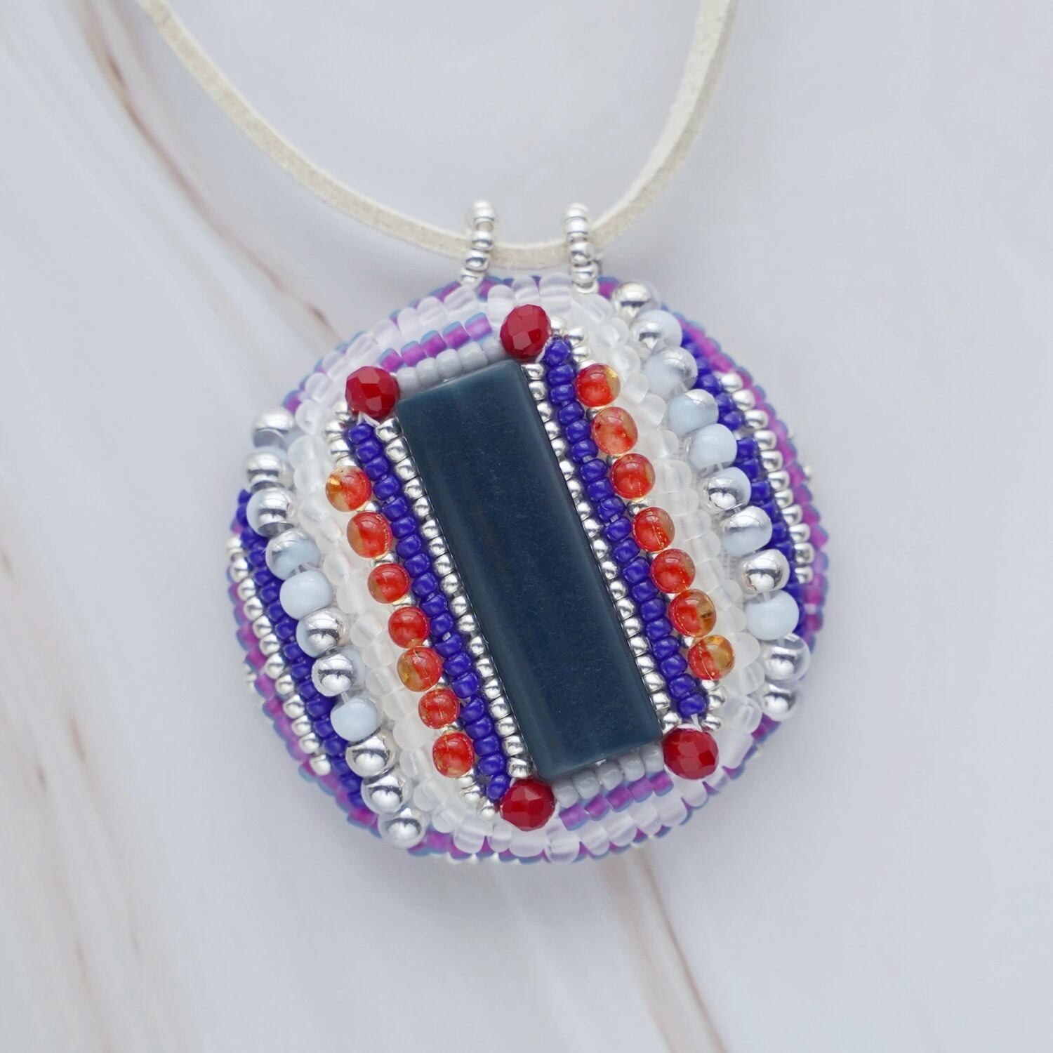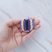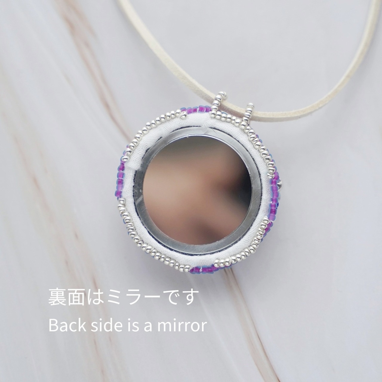 表面には細かなビーズ刺繍を施し、裏面は直径約3cmのミラーになっています。 紐はすっぽりかぶれる約70cmの長さで、裏返して鏡を見るのにも便利な設計です。