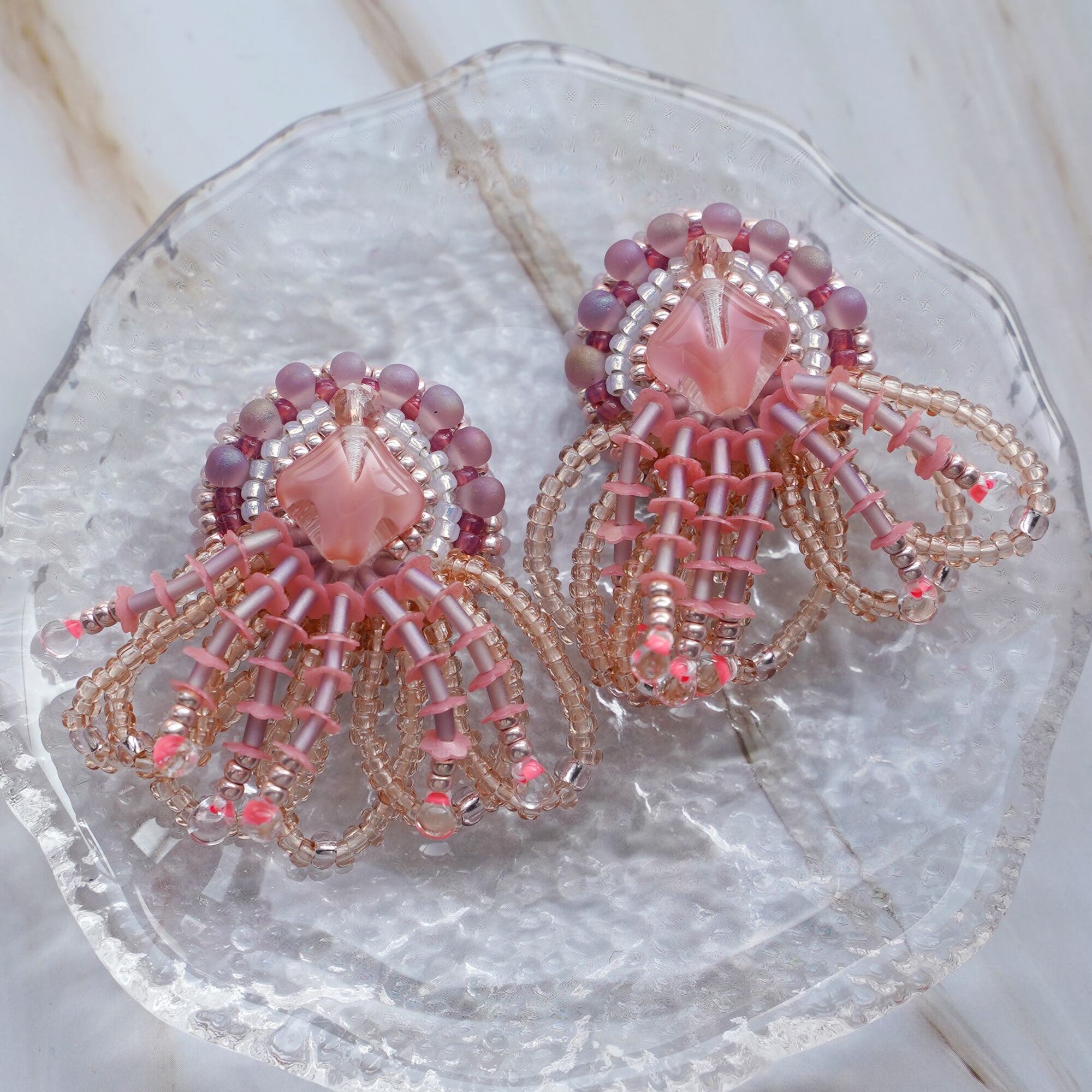 ビーズ刺繍の豪華なフリンジイヤリング/ピアス|No.2|クラゲのような透明感|ピンク&クリア|個性的な一点物|金具選択可