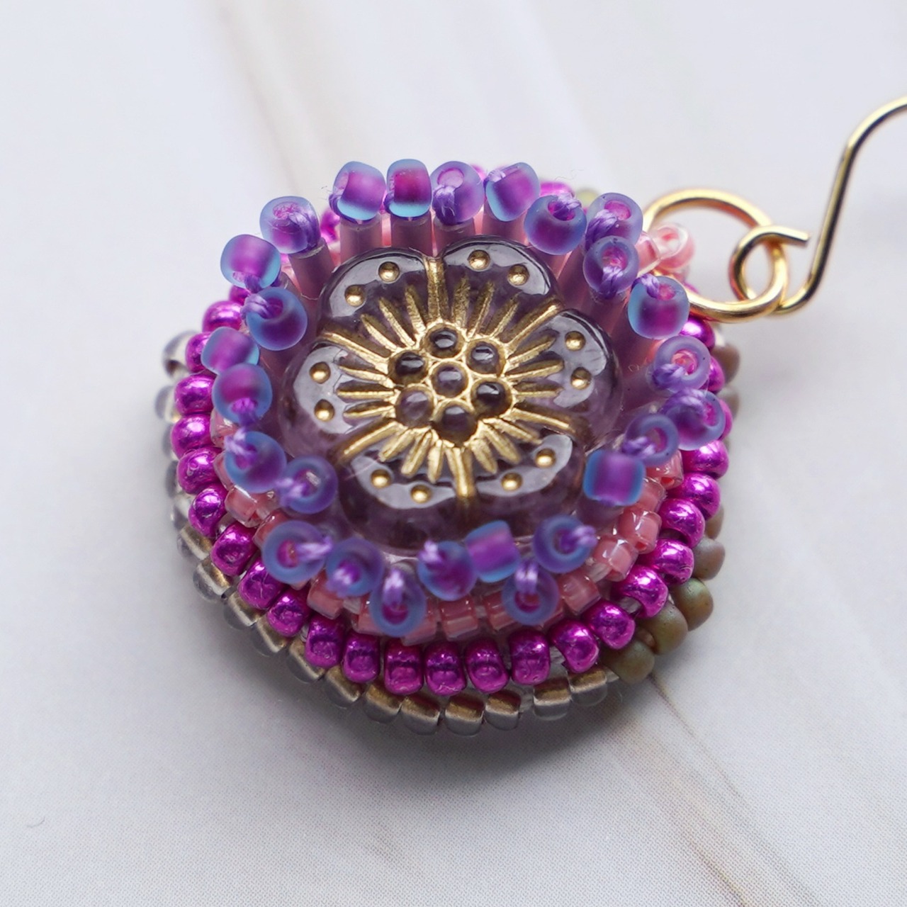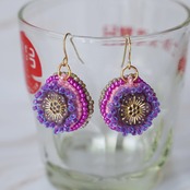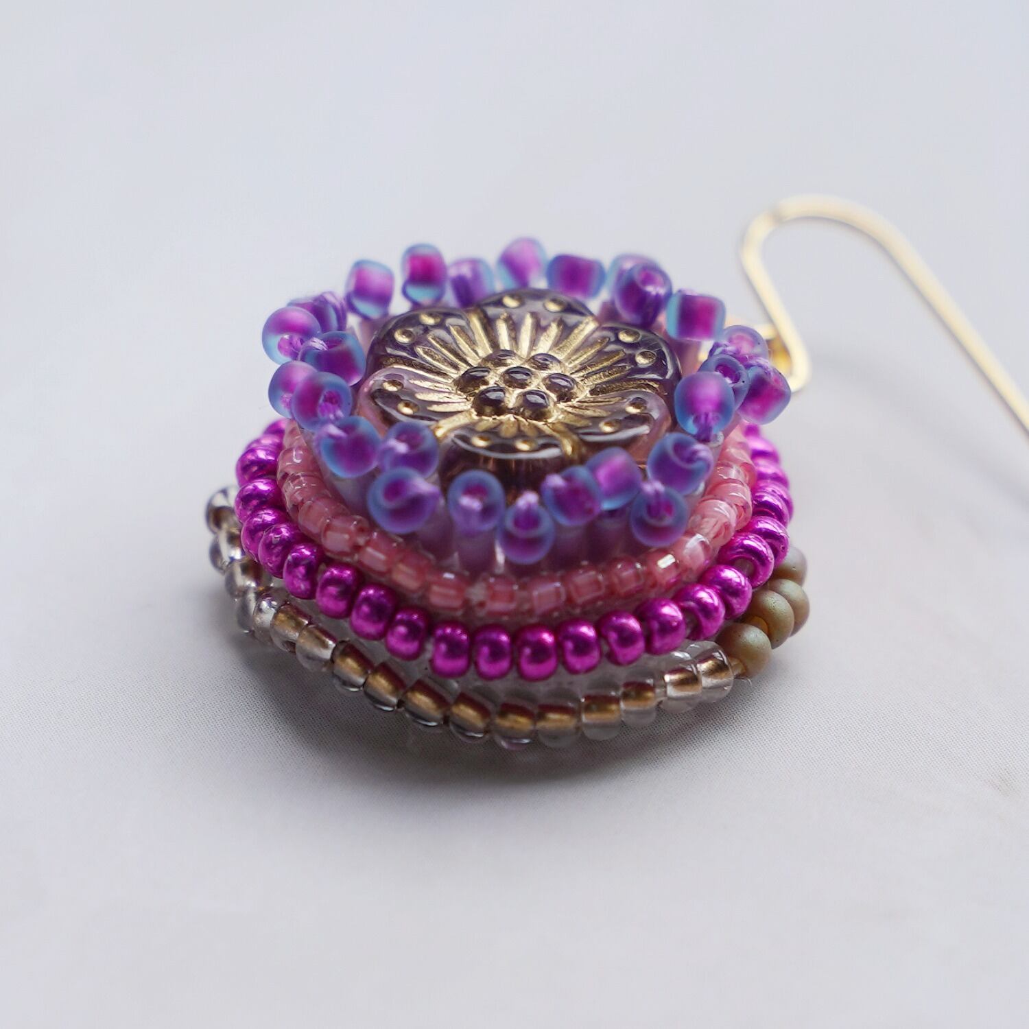 小さな作品を作るとき、まずメインのビーズを選びます。 そのビーズがいちばん美しく見えるように、隙間なく刺繍を重ねていくと、色とりどりのビーズたちがまるでおしゃべりしているような、にぎやかな仕上がりになります。