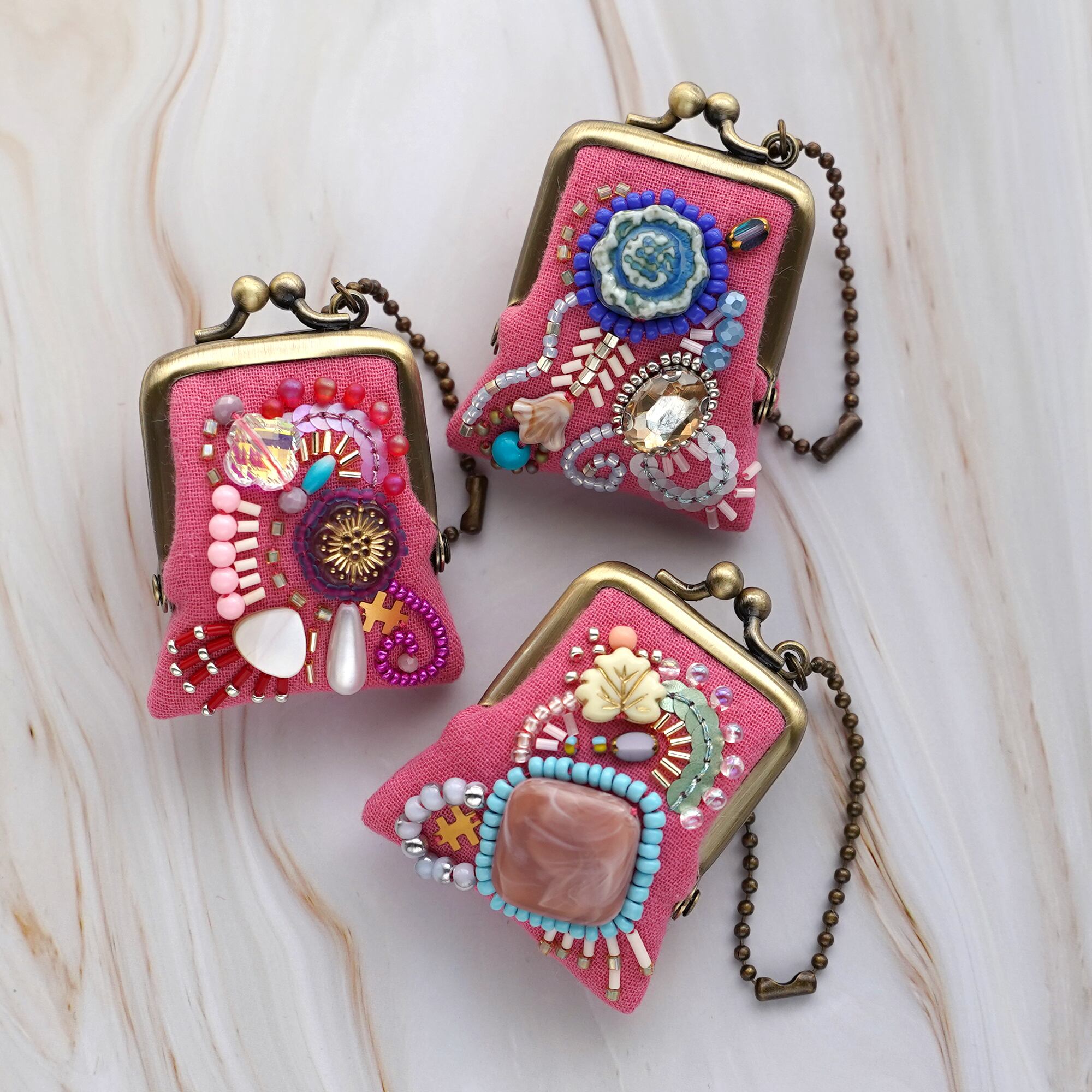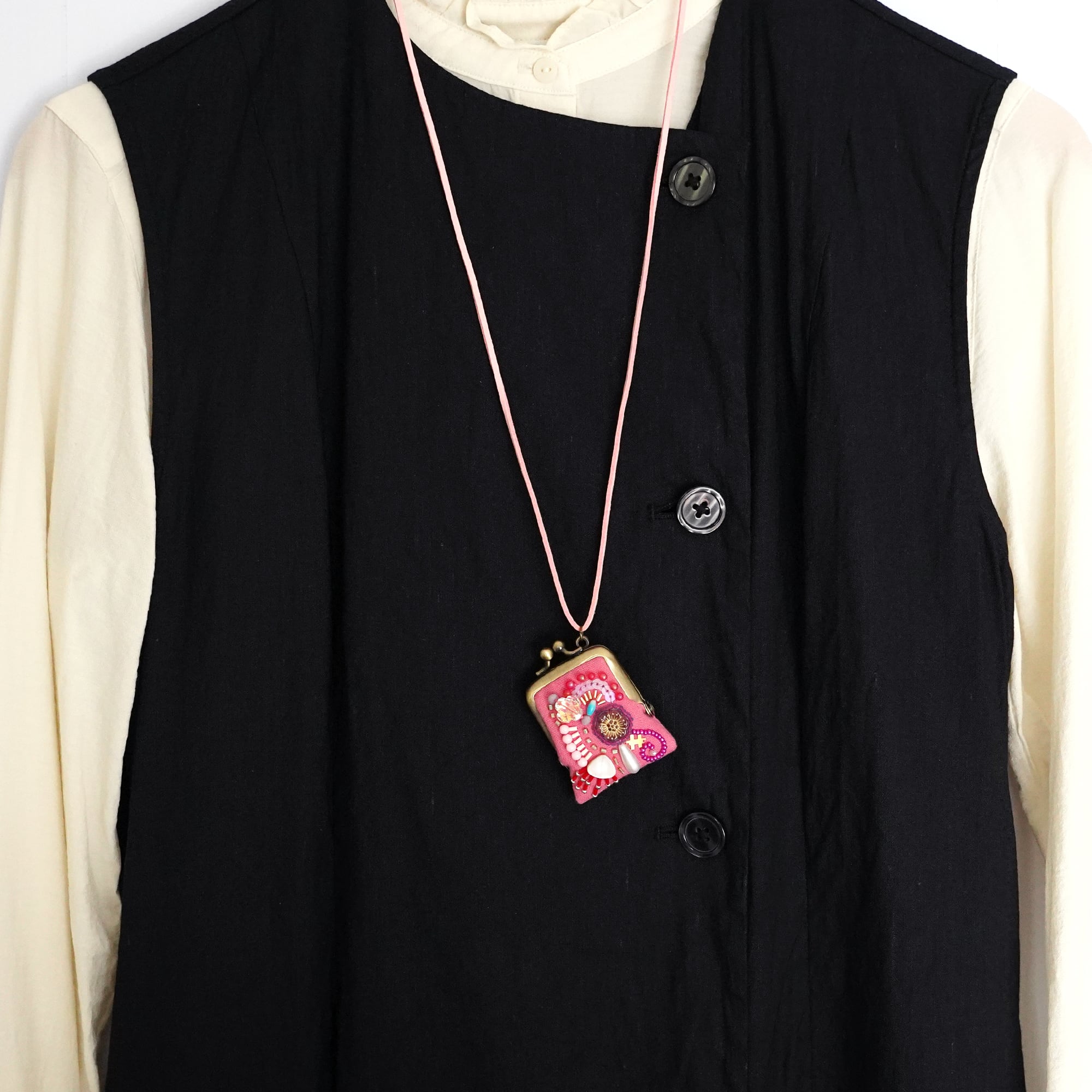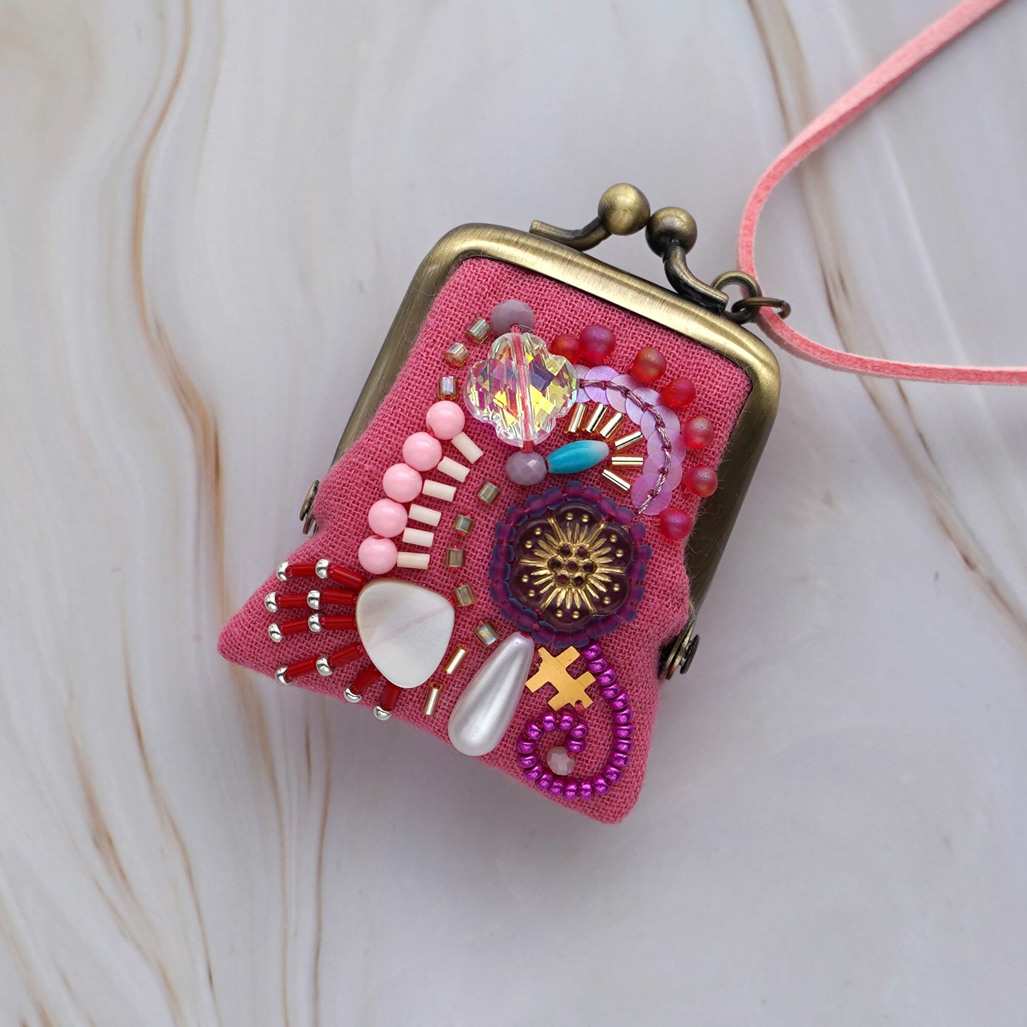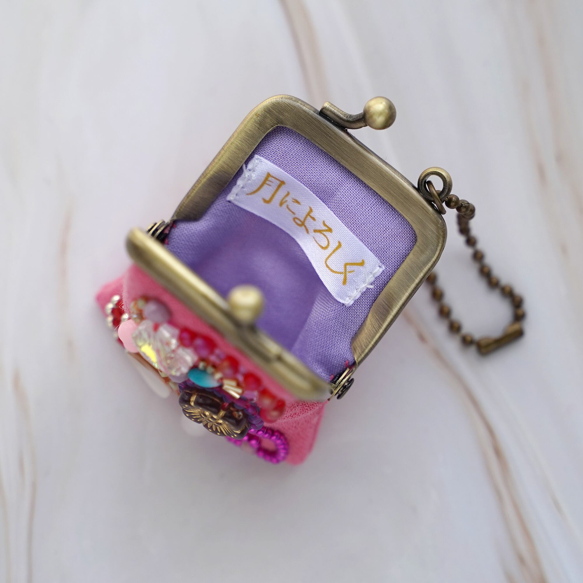 小さなビーズ刺繍のがま口 No.72|ピンクのガーゼ|ネックレス・バッグチャームにも|アクセサリーケース|一点物