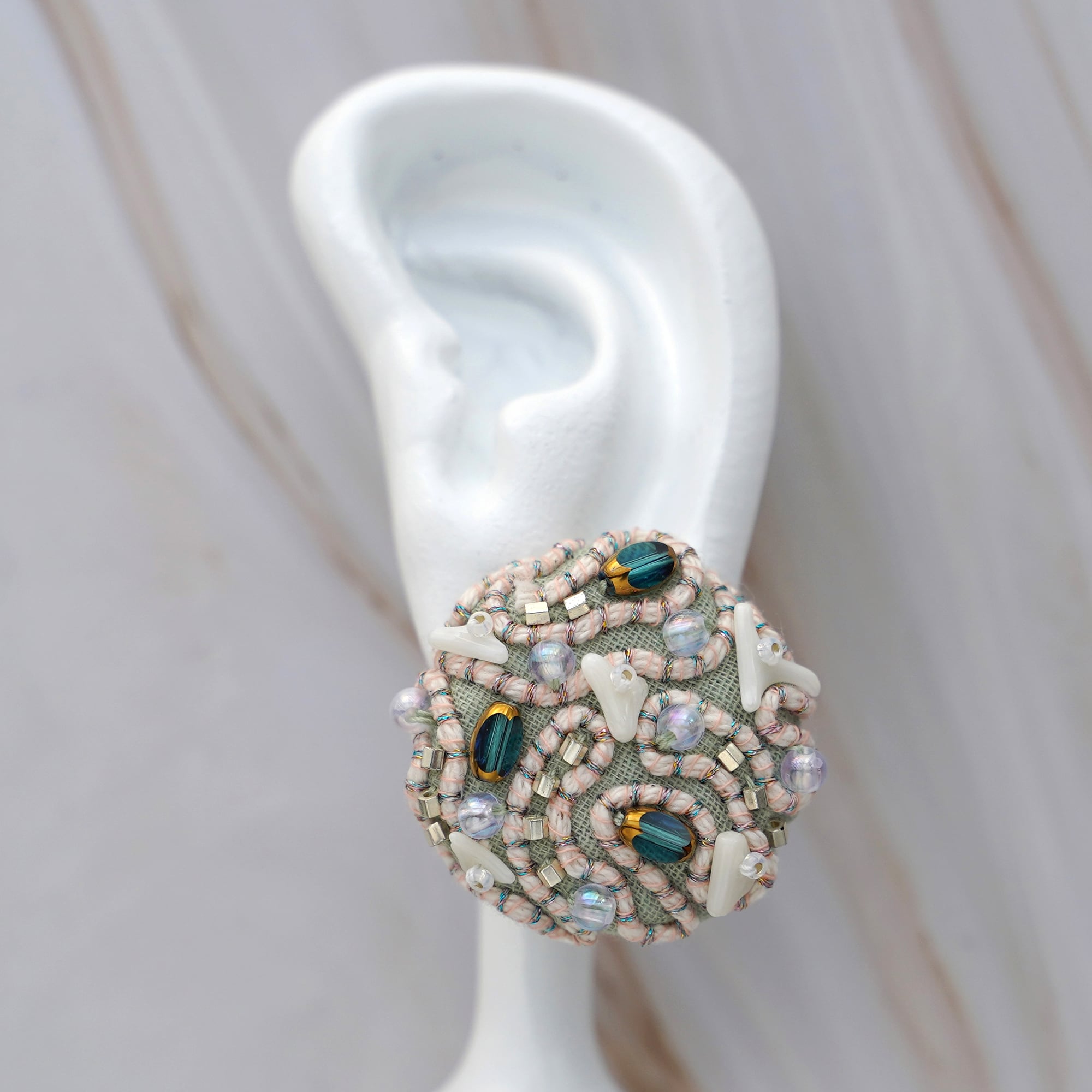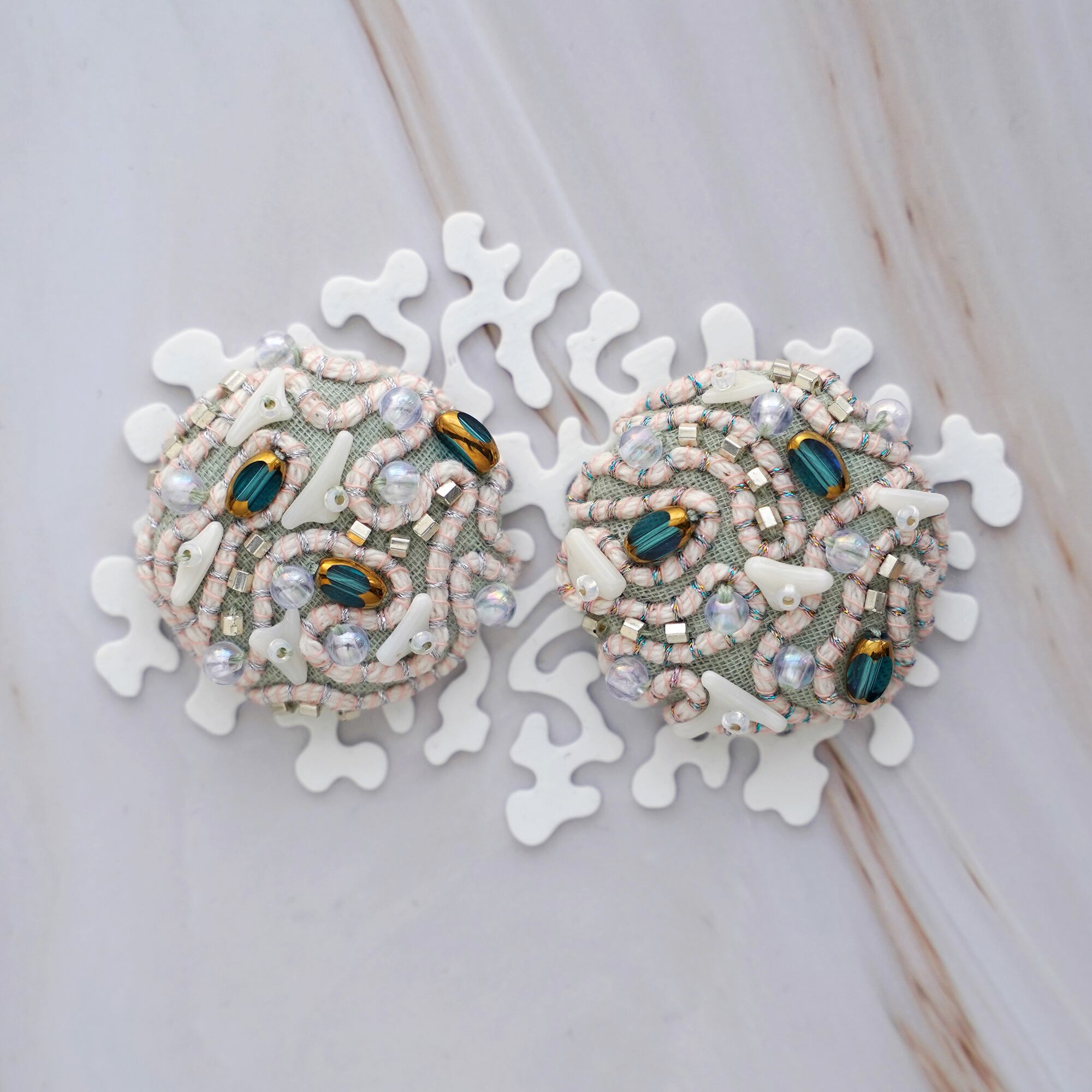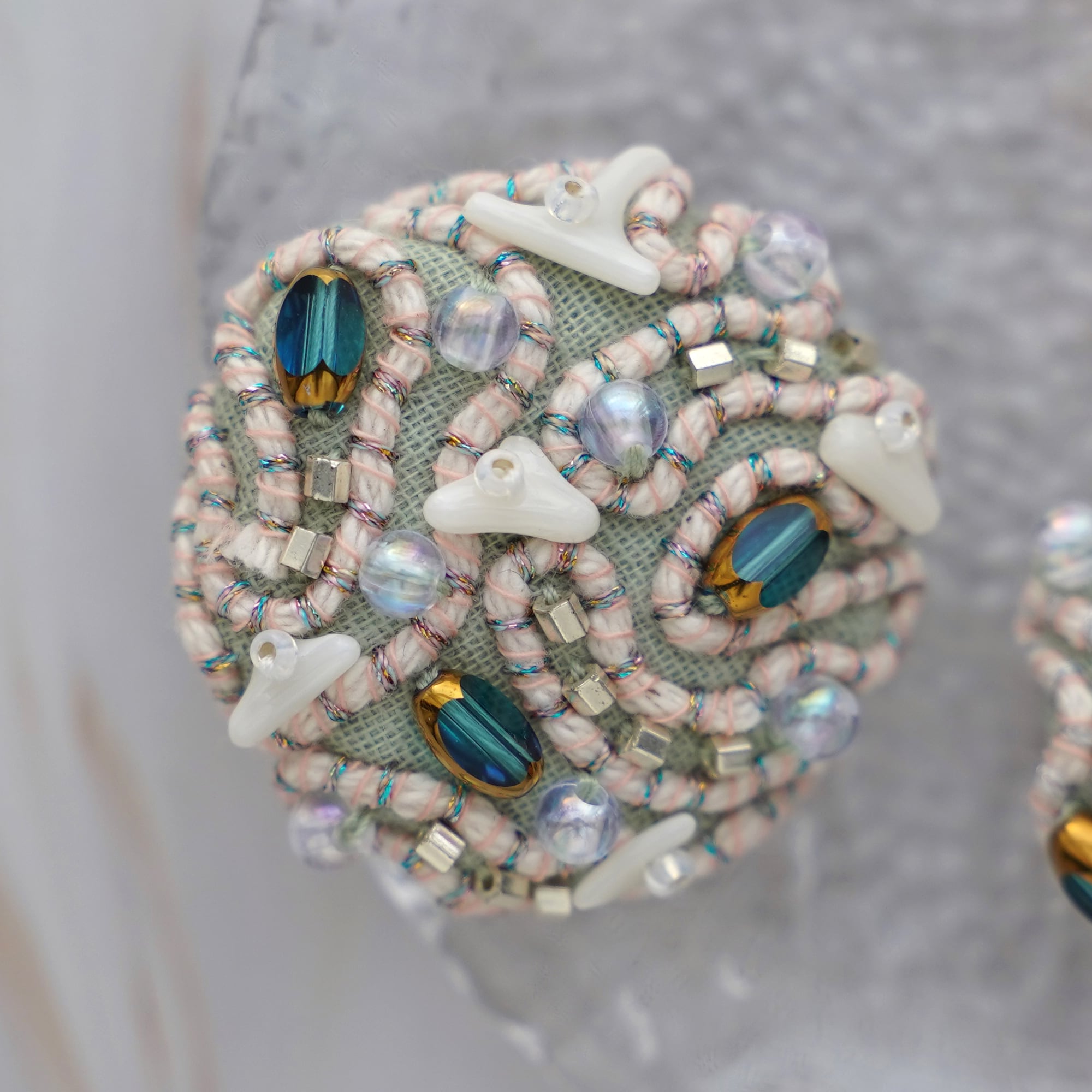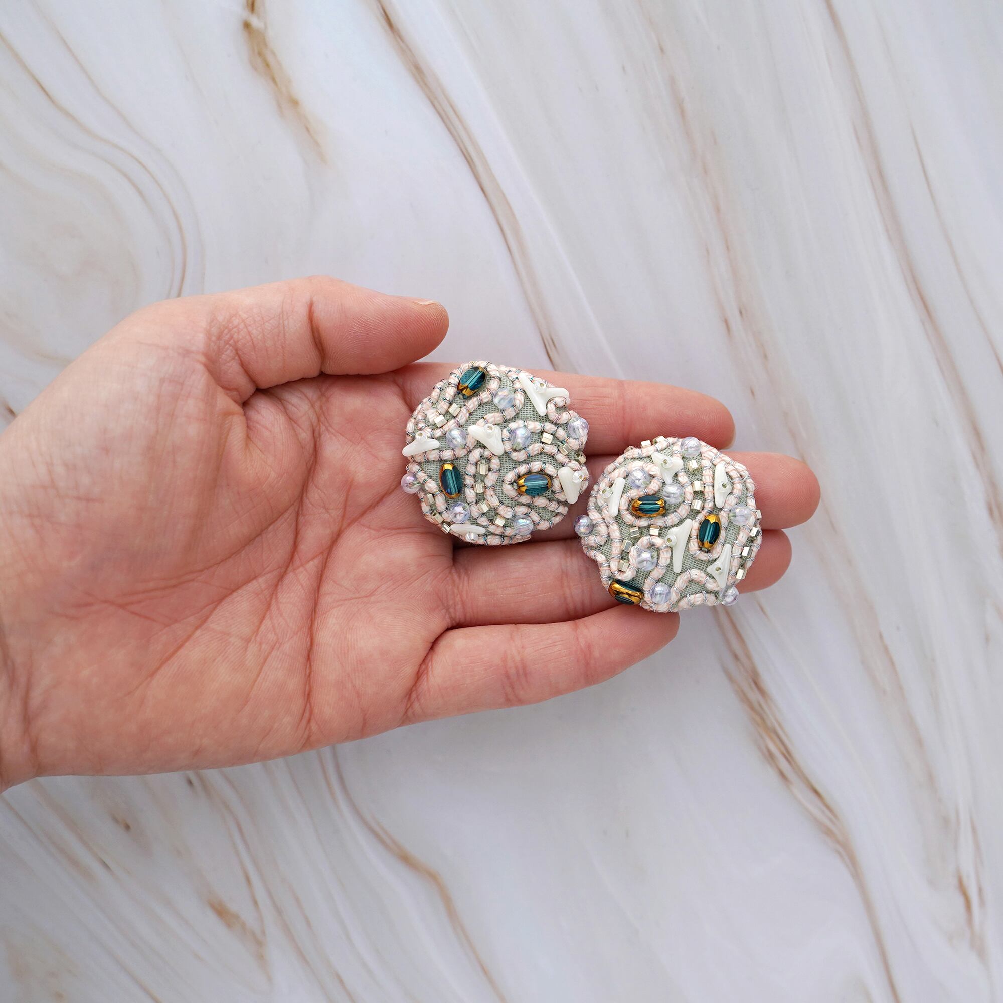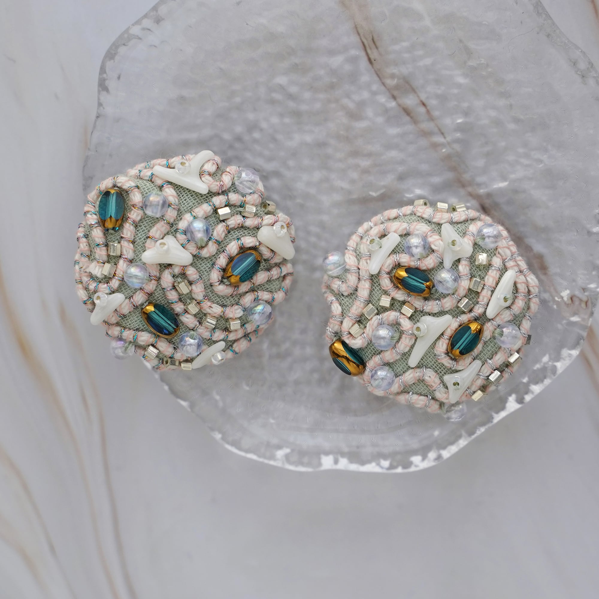 海の記憶ピアス・イヤリング1|一点物×セージグリーン×大ぶり×選べる金具×ビーズ刺繍×サージカルステンレス