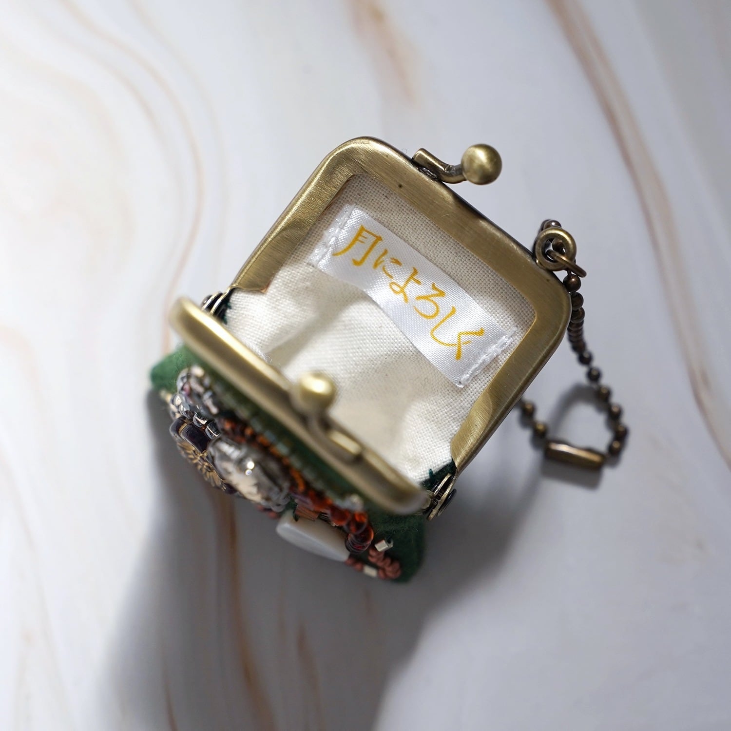 小さなビーズ刺繍のがま口 No.79|グリーン×ウール|ネックレス・バッグチャームにも|アクセサリーケース|一点物
