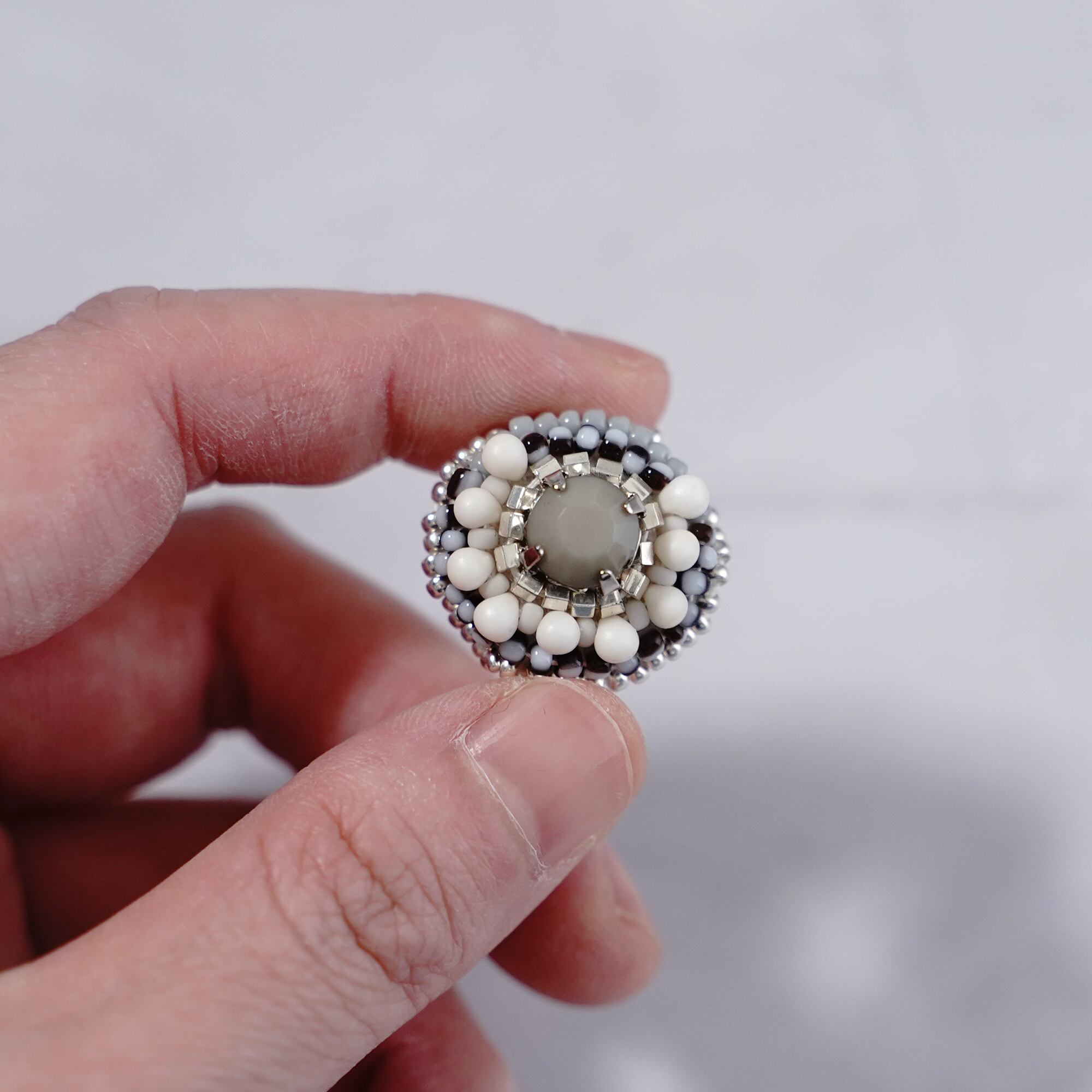そのビーズを引き立てるように隙間なく刺繍をすると、カラフルでにぎやかで、まるでおしゃべりをしているように仕上がります。