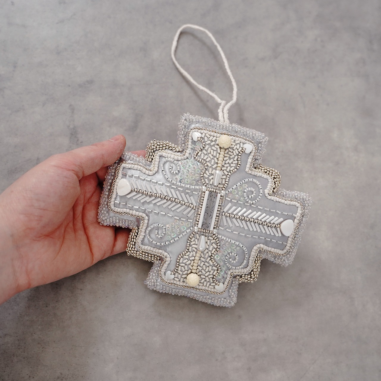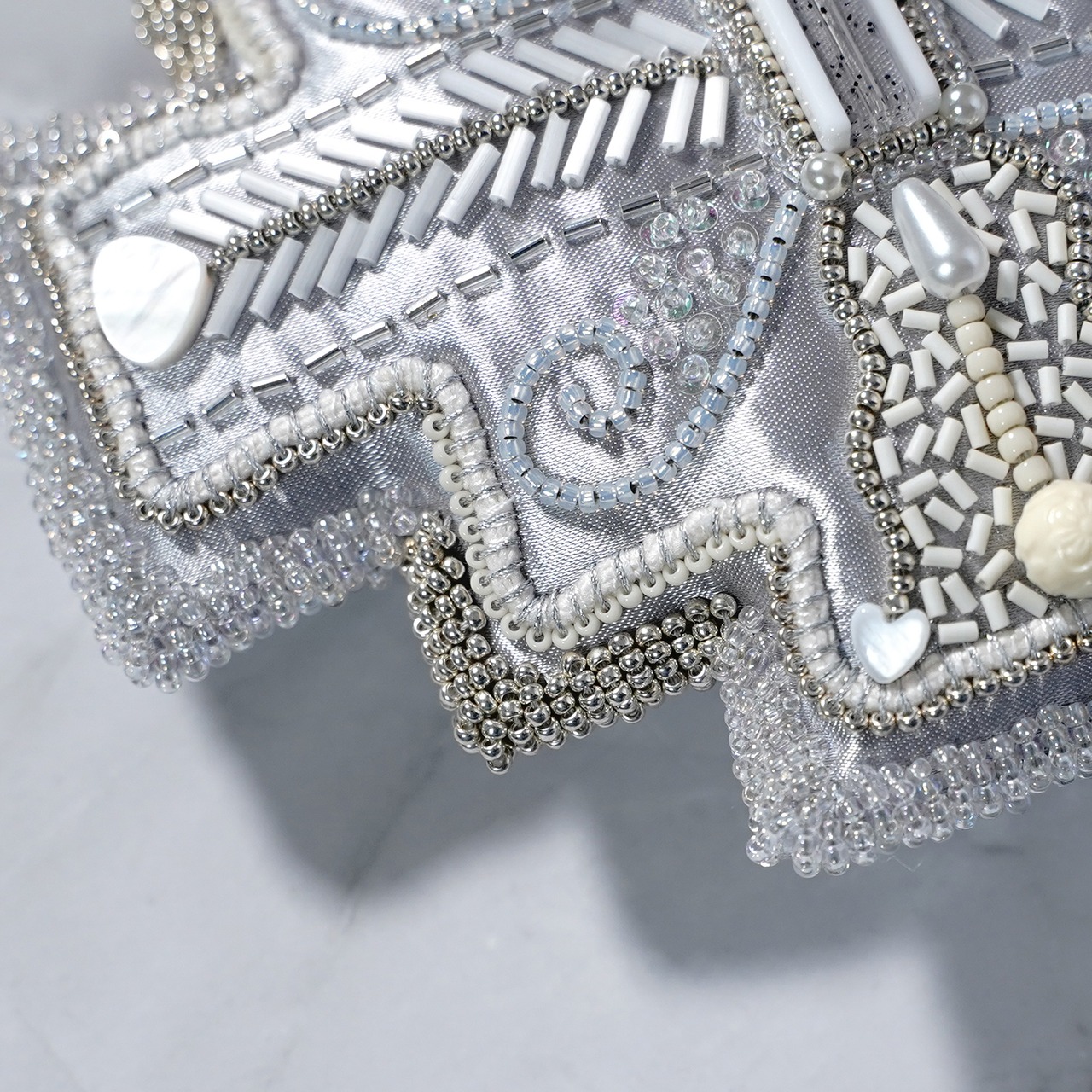 大きなパーツはすべて接着剤で固定した後、糸でしっかり縫い付けています。 刺繍糸は生地の裏からほつれ止めを施し、簡単には壊れないよう丁寧に仕上げています。