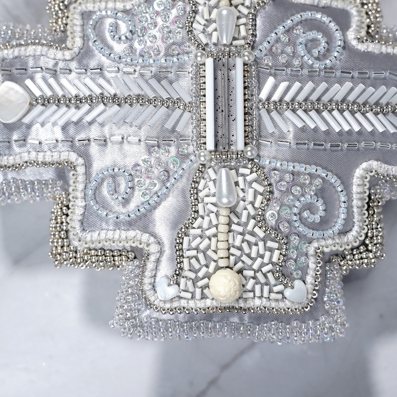 サテンの生地にビンテージビーズシードビーズ、スパンコールやコットンのコードなど、とっておきの素材をたっぷり使い、豪華なデザインに仕上げました。