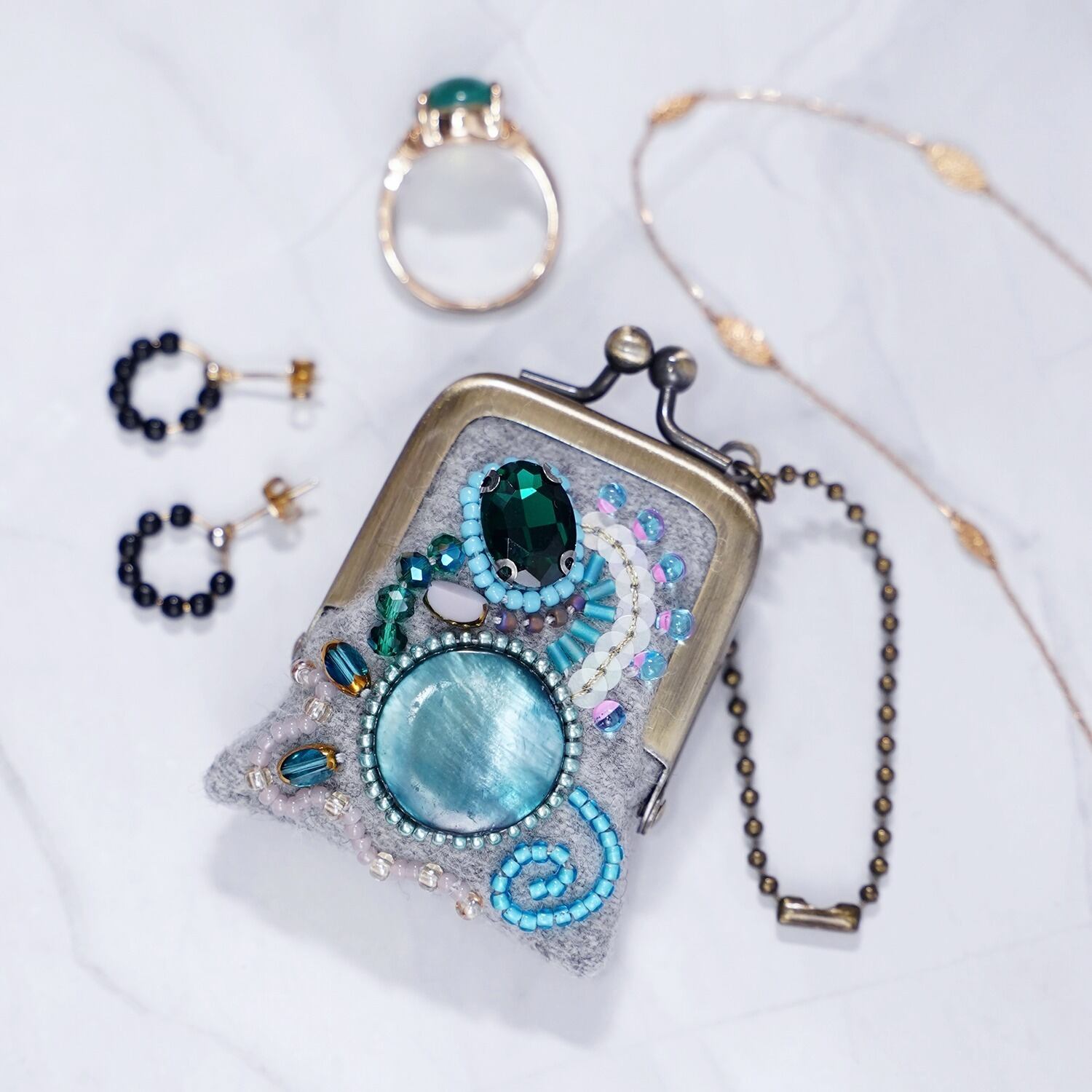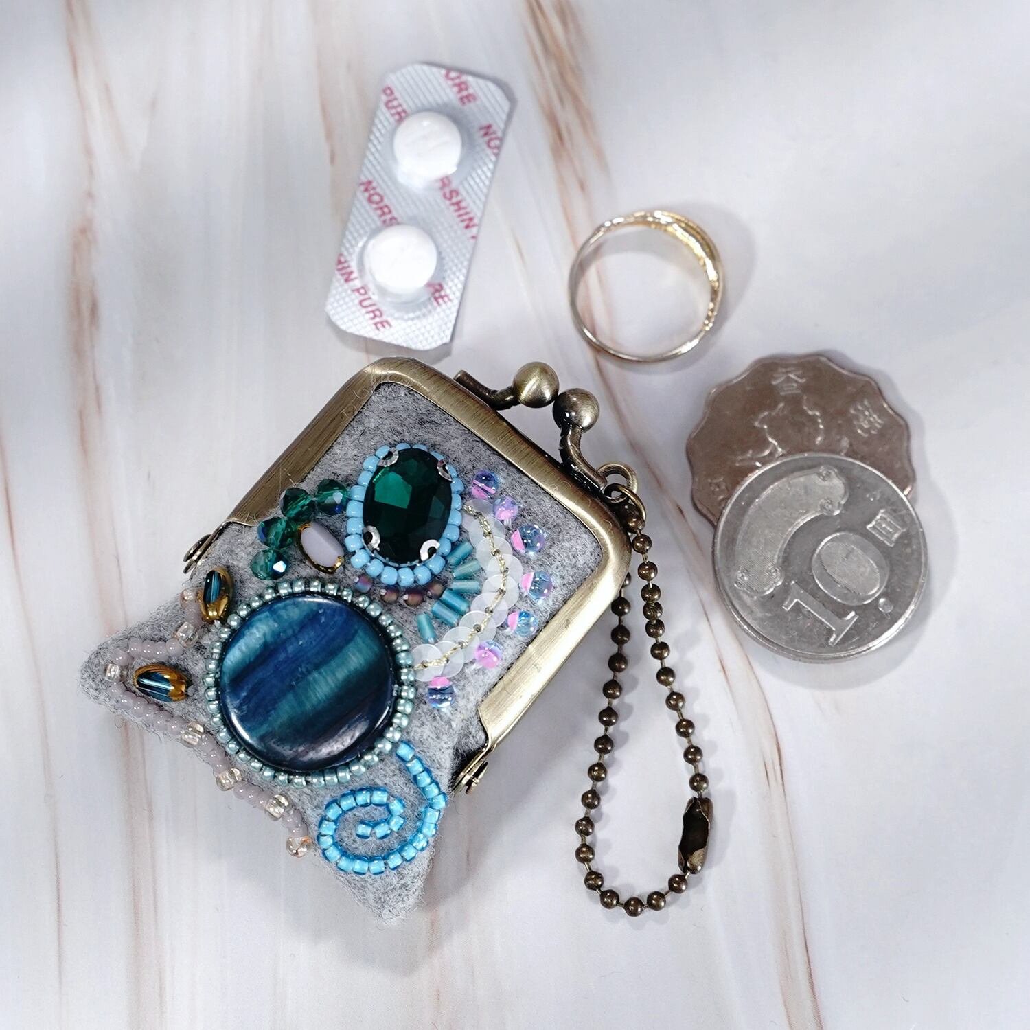 こんなに小さくて細かな刺繍のがま口があるんだ!── アクセサリーや常備薬など、細かなものがおさまる、華やかなビーズ刺繍の小さな小さながま口です。