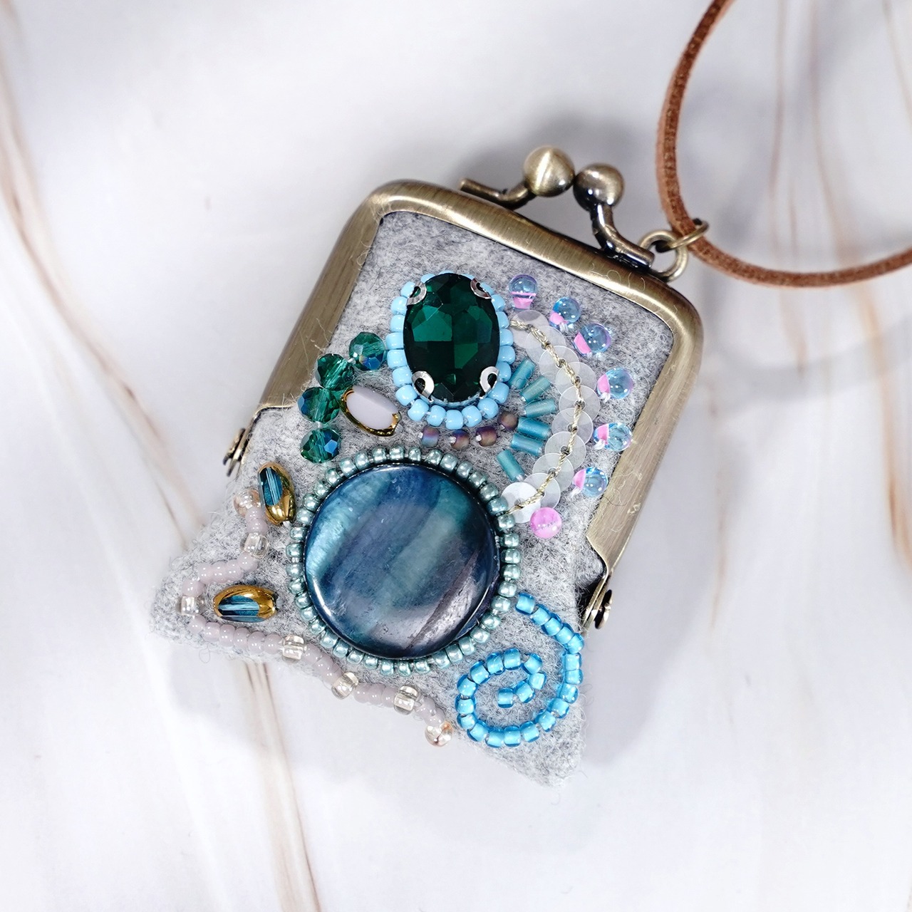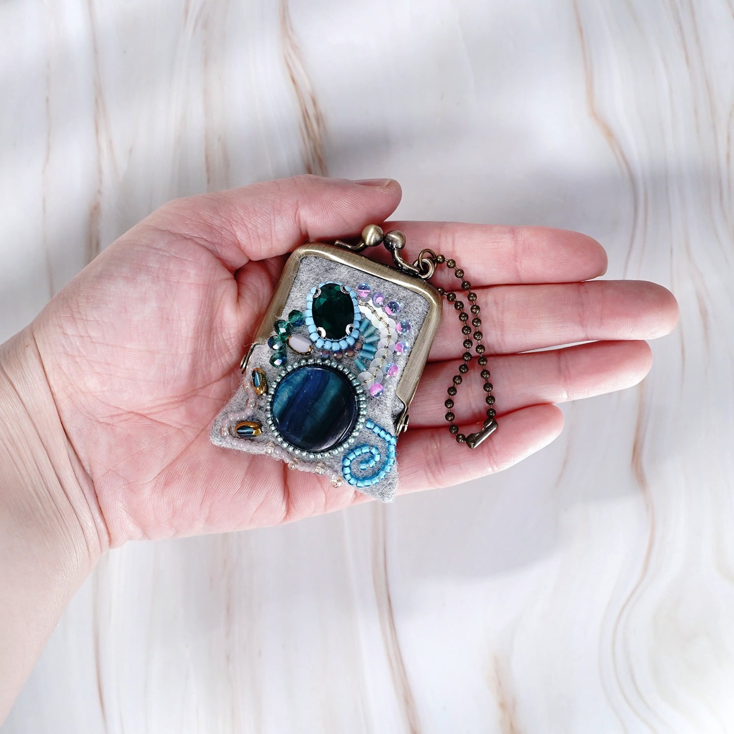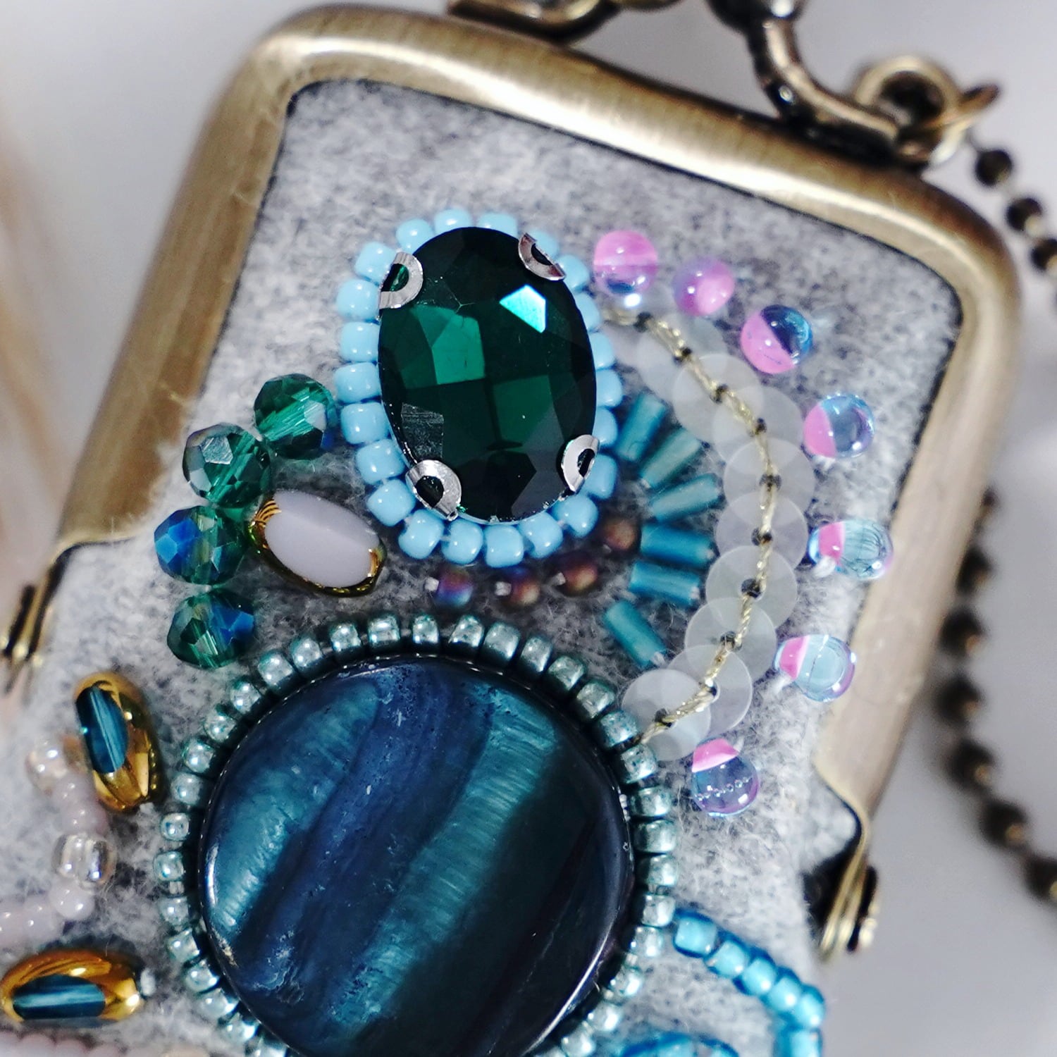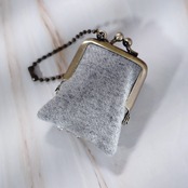 小さなビーズ刺繍のがま口 No.80|グレー×ウール|ネックレス・バッグチャームにも|アクセサリーケース|一点物