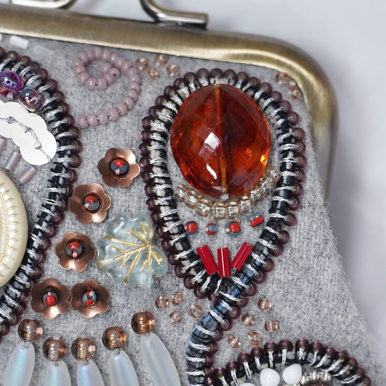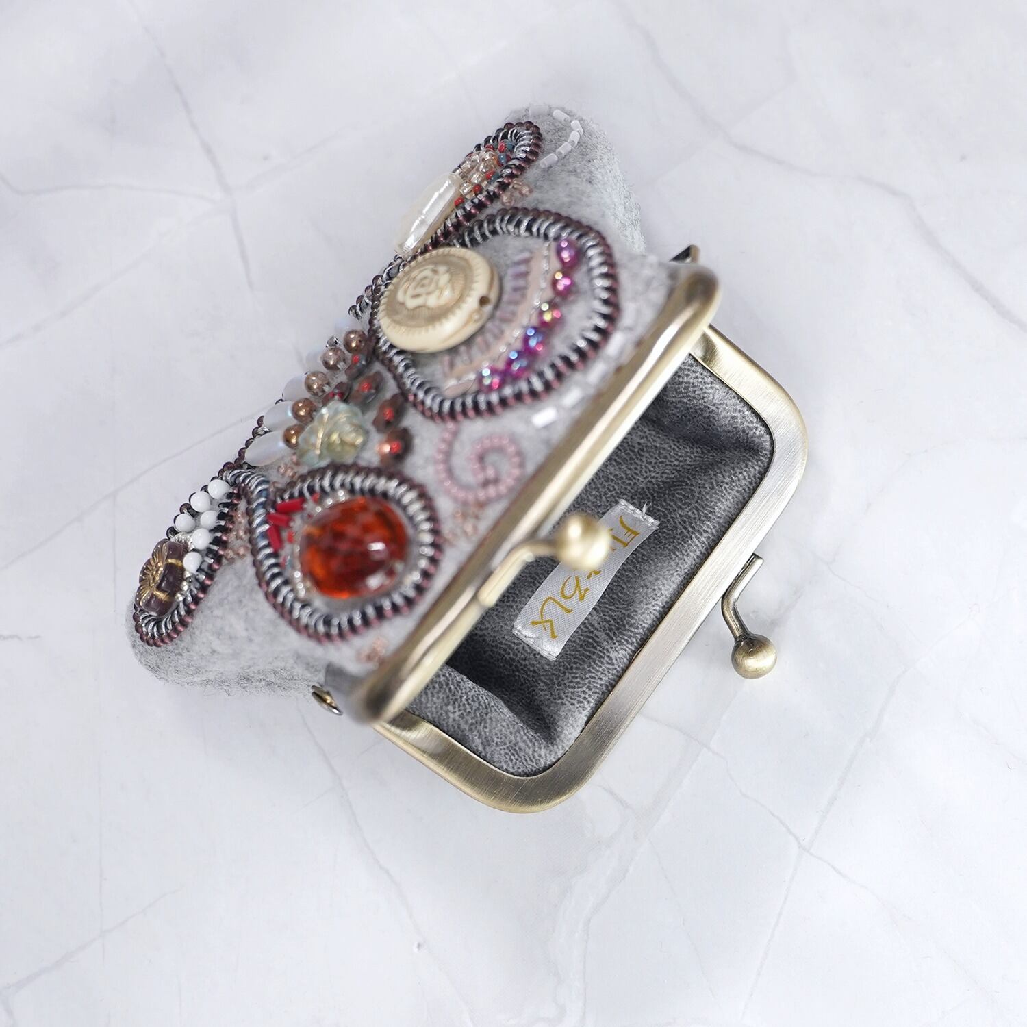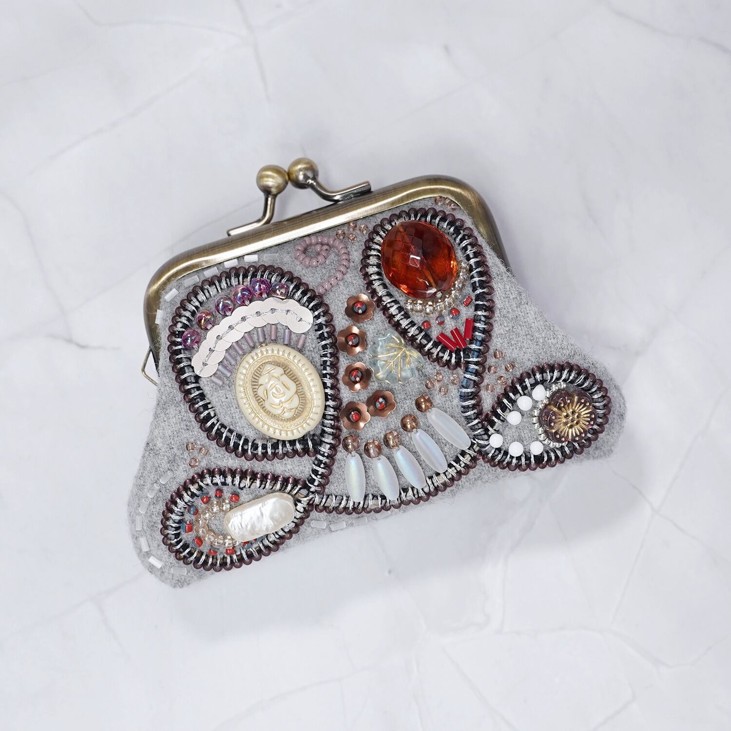 ビーズ刺繍の小さながま口 No.15|グレー|ウール素材|マチなしポーチ|手刺繍|一点もの
