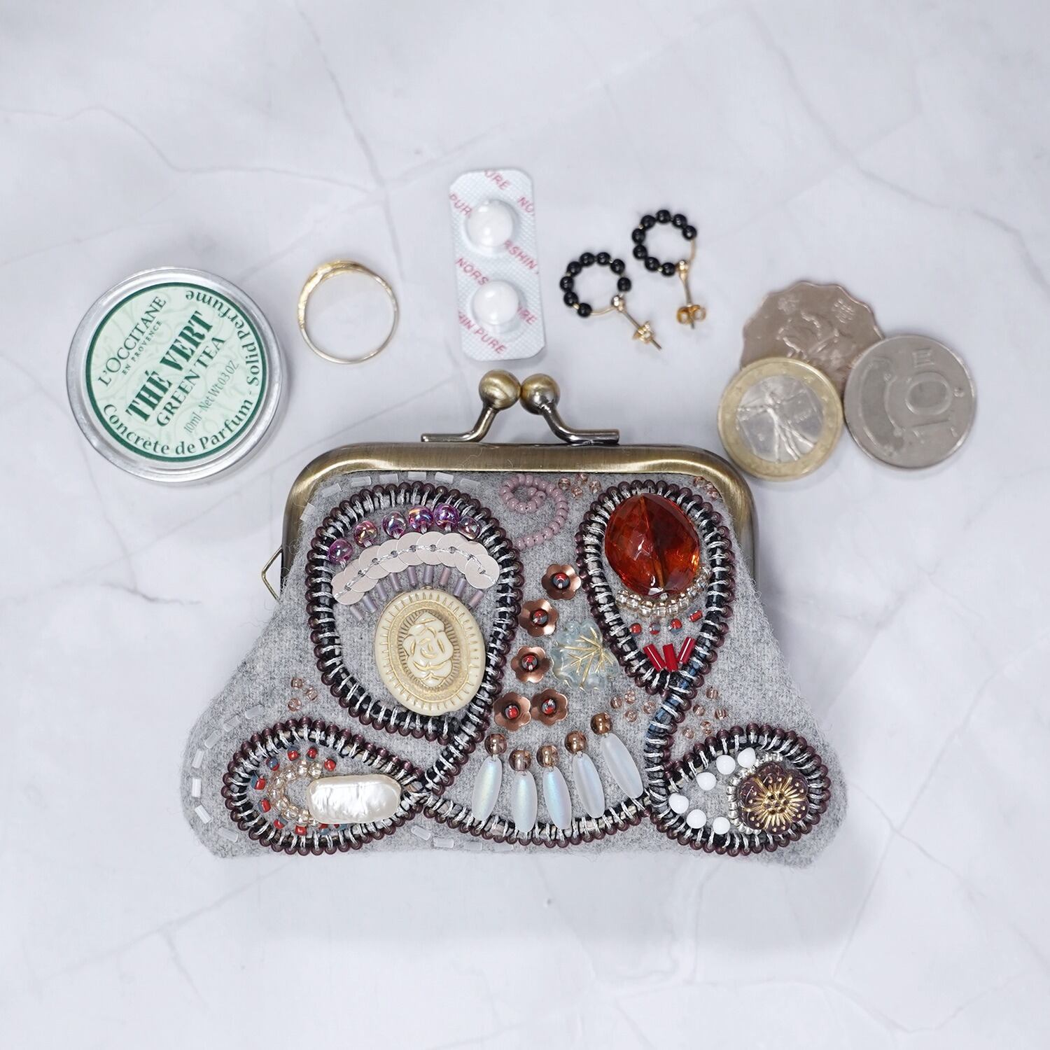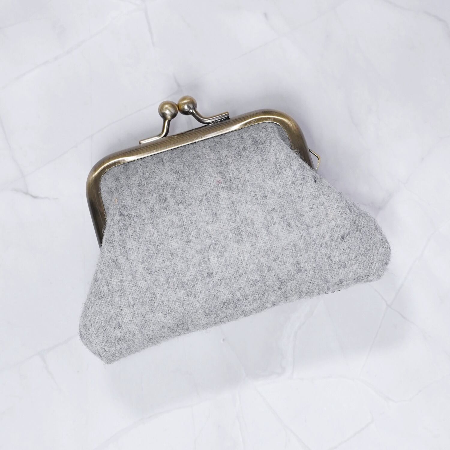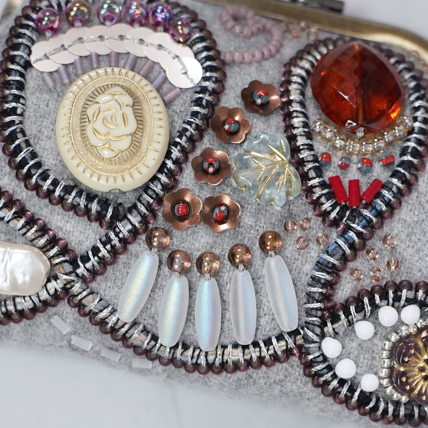 ビーズ刺繍の小さながま口 No.15|グレー|ウール素材|マチなしポーチ|手刺繍|一点もの