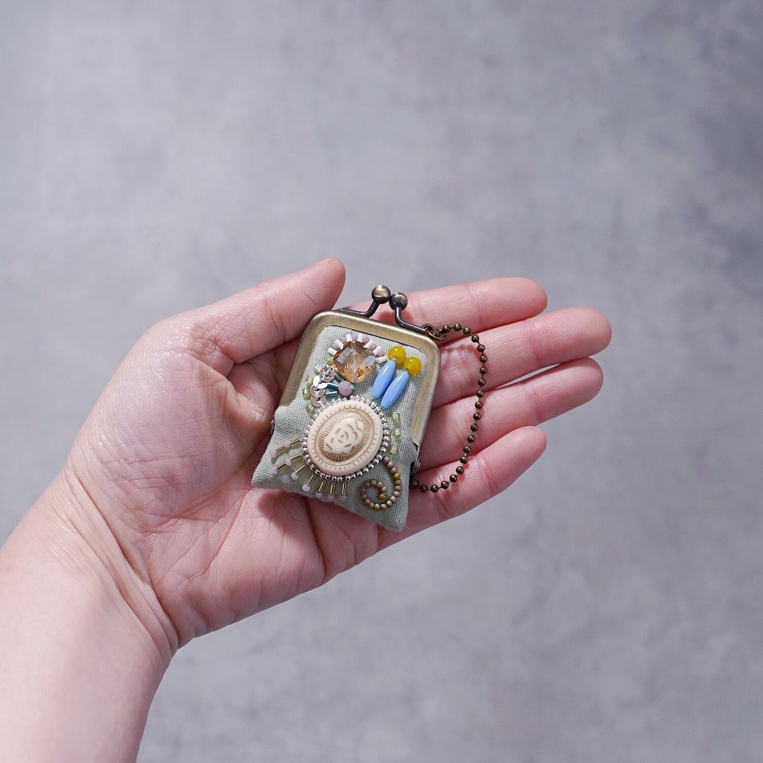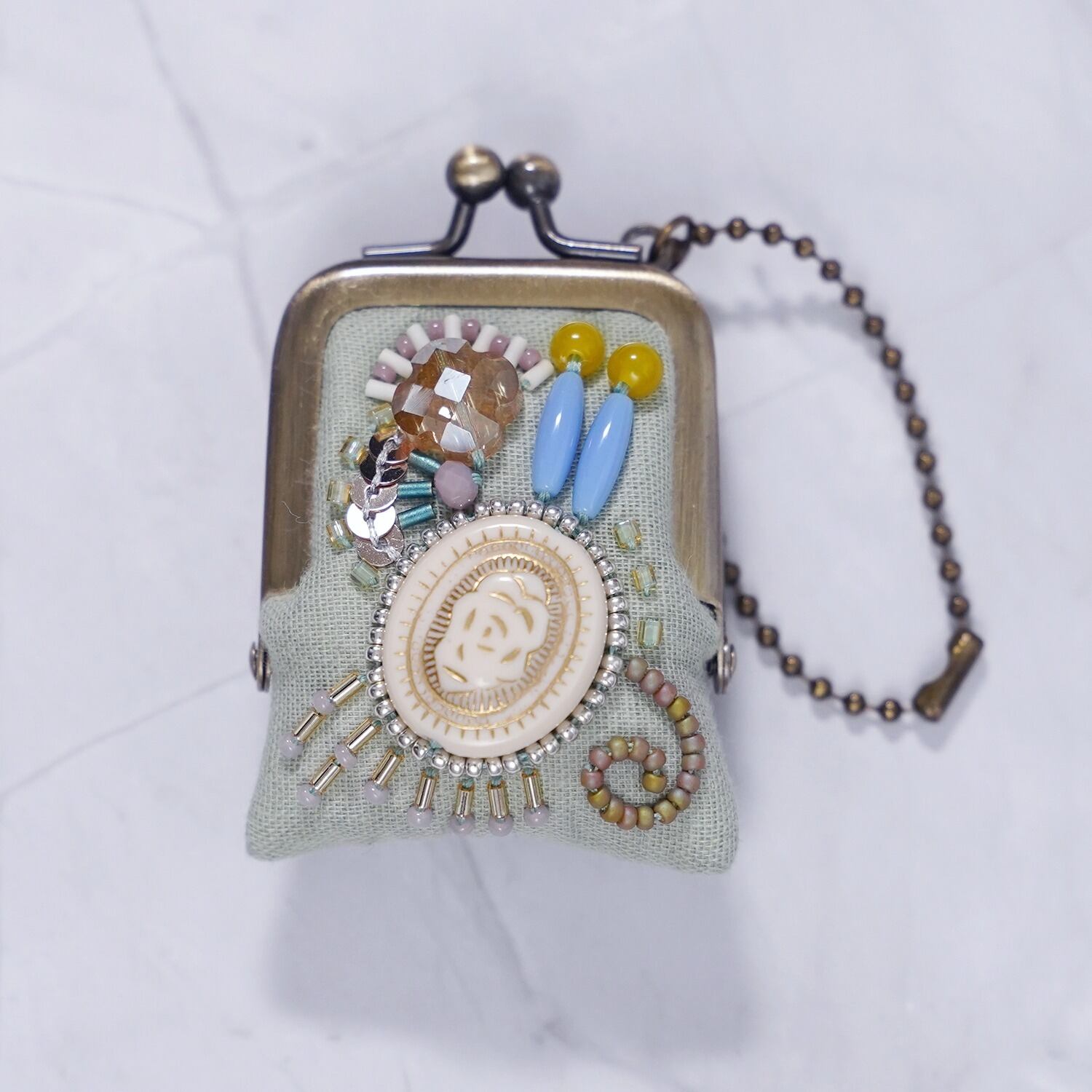 小さなビーズ刺繍のがま口 No.93|セージグリーン×ガーゼ|ネックレス・バッグチャームにも|アクセサリーケース|一点物