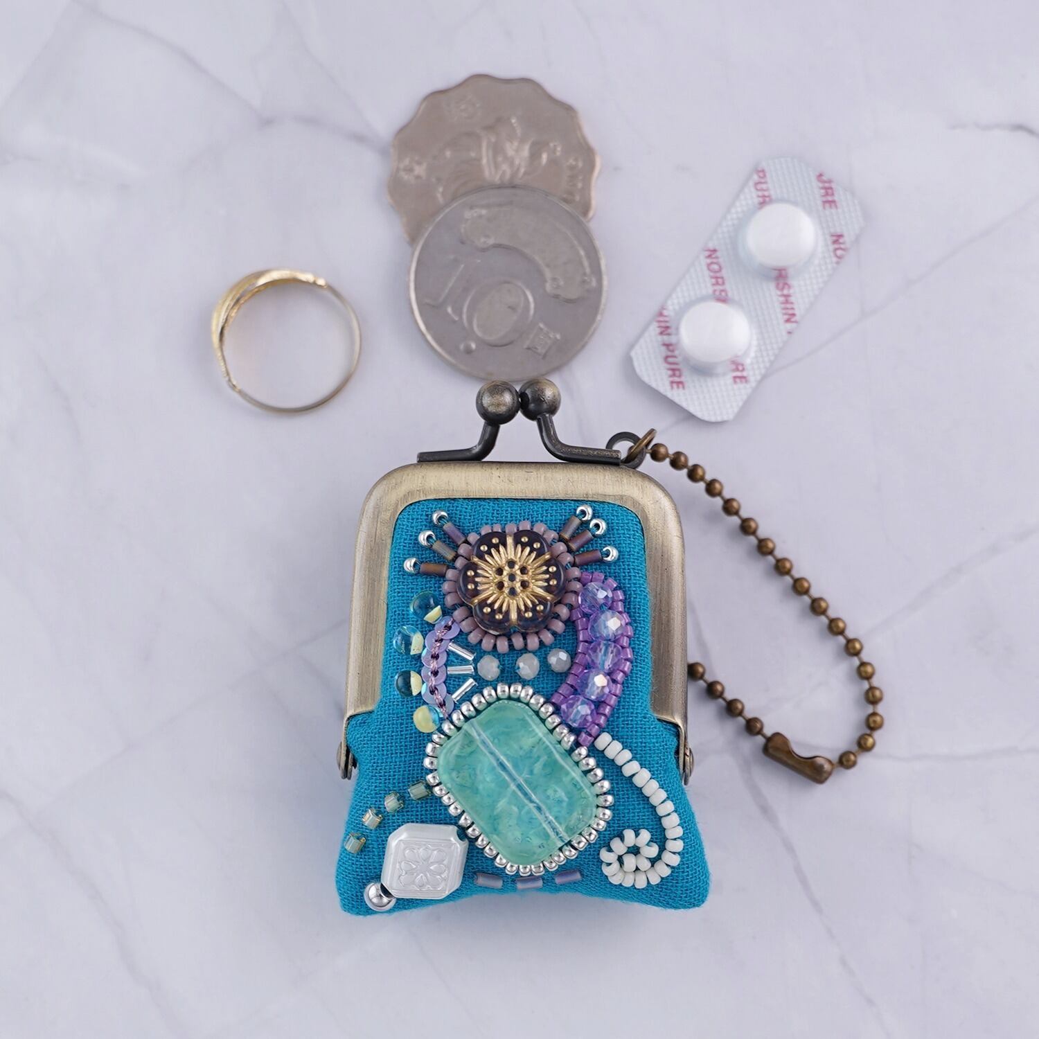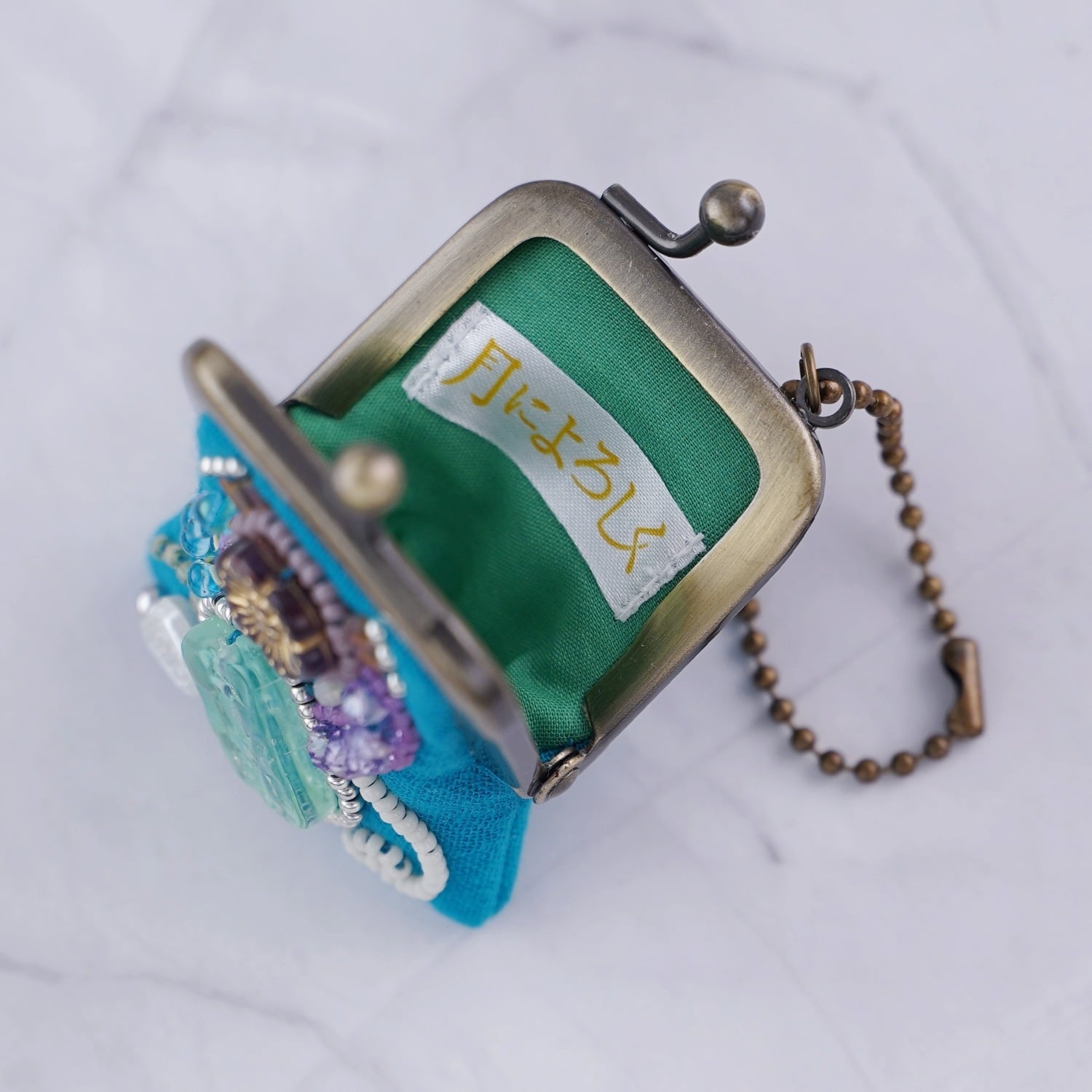 小さなビーズ刺繍のがま口 No.94|セルリアンブルー×ガーゼ|ネックレス・バッグチャームにも|アクセサリーケース
