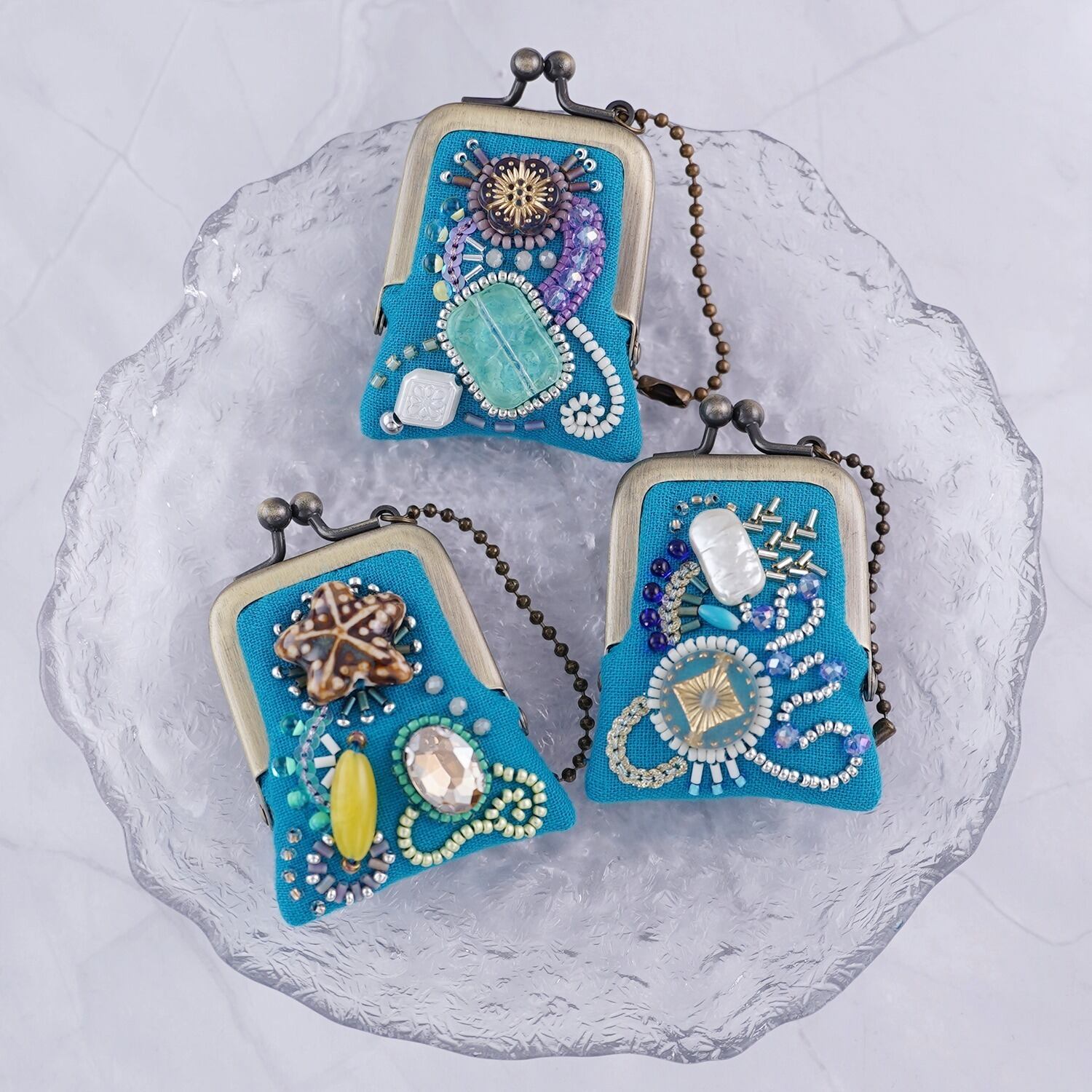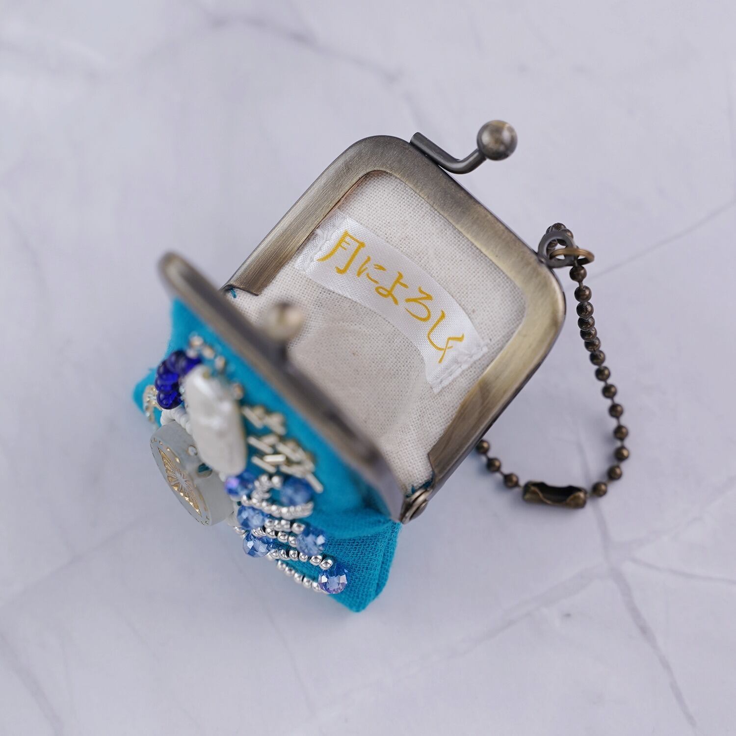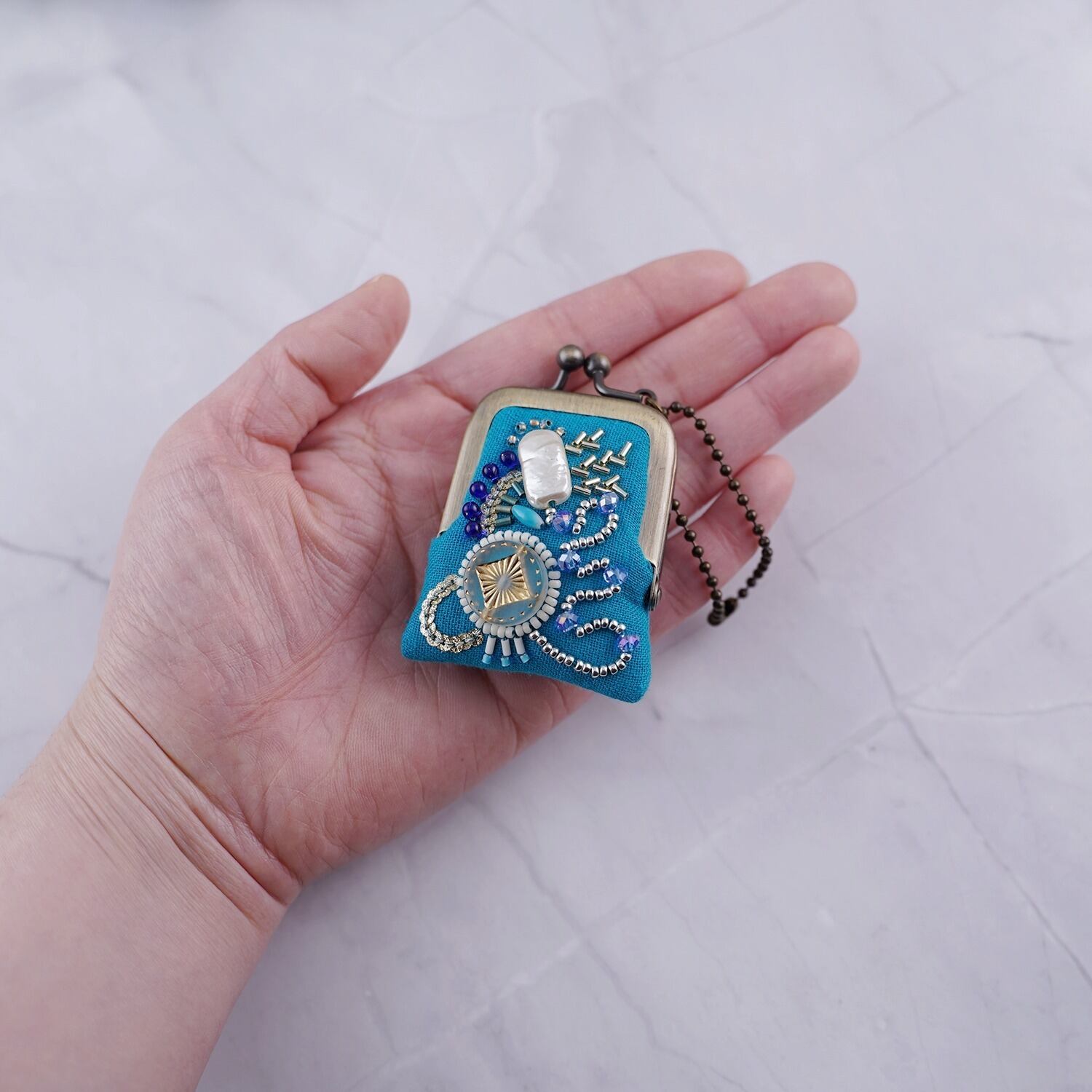 小さなビーズ刺繍のがま口 No.95|セルリアンブルー×ガーゼ|ネックレス・バッグチャームにも|アクセサリーケース