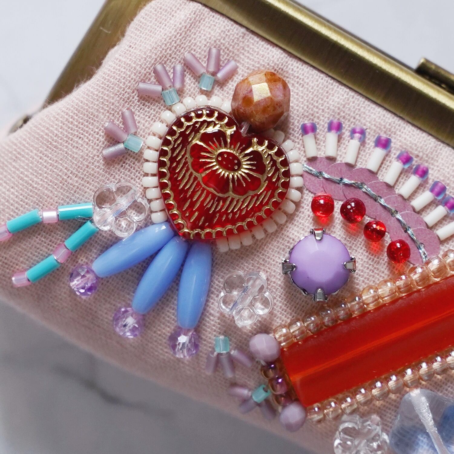 リップケース| ビーズ刺繍のがま口 No.1|さくらピンク×ガーゼ|口紅ケース|アクセサリーケース