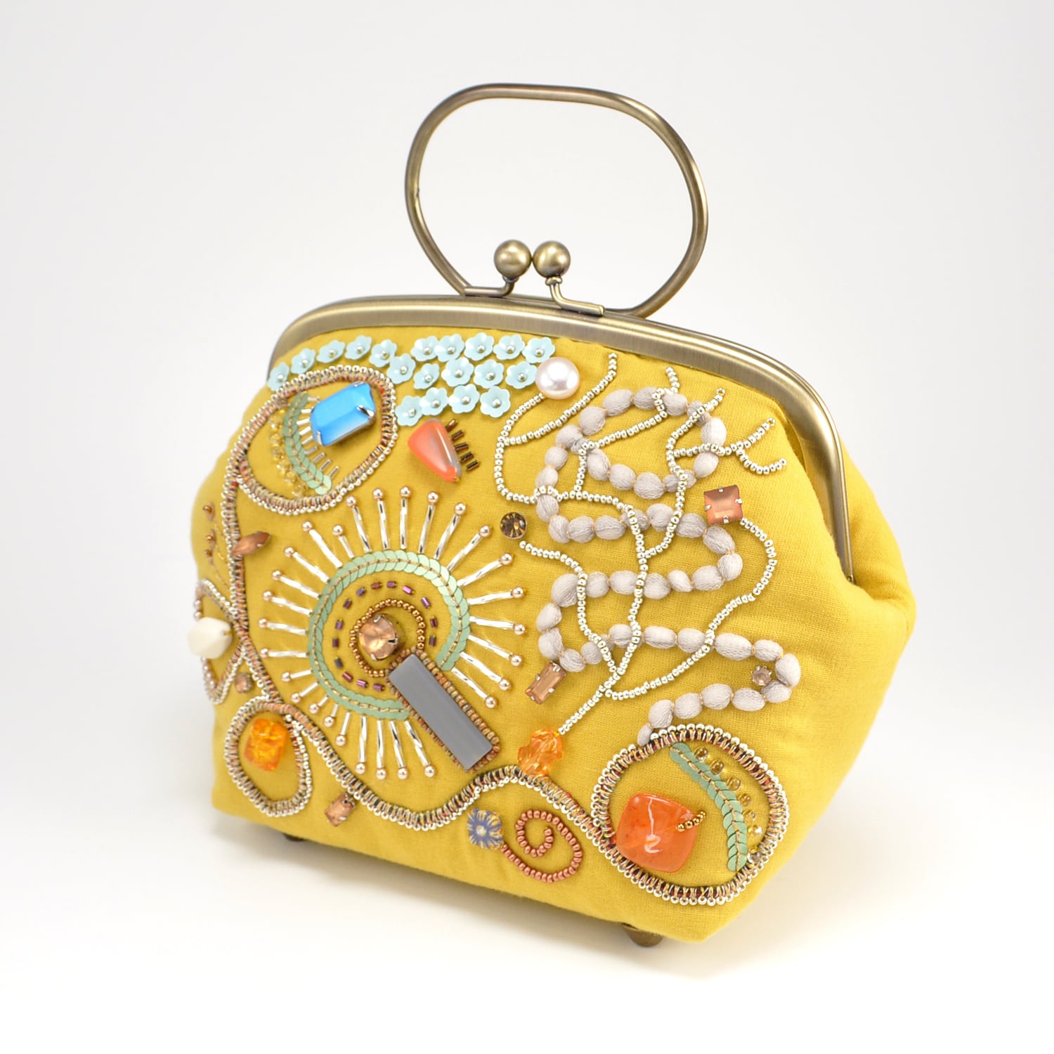 きっちりと縫い付けたビーズや変わり糸が抽象画のように全体に踊っています。