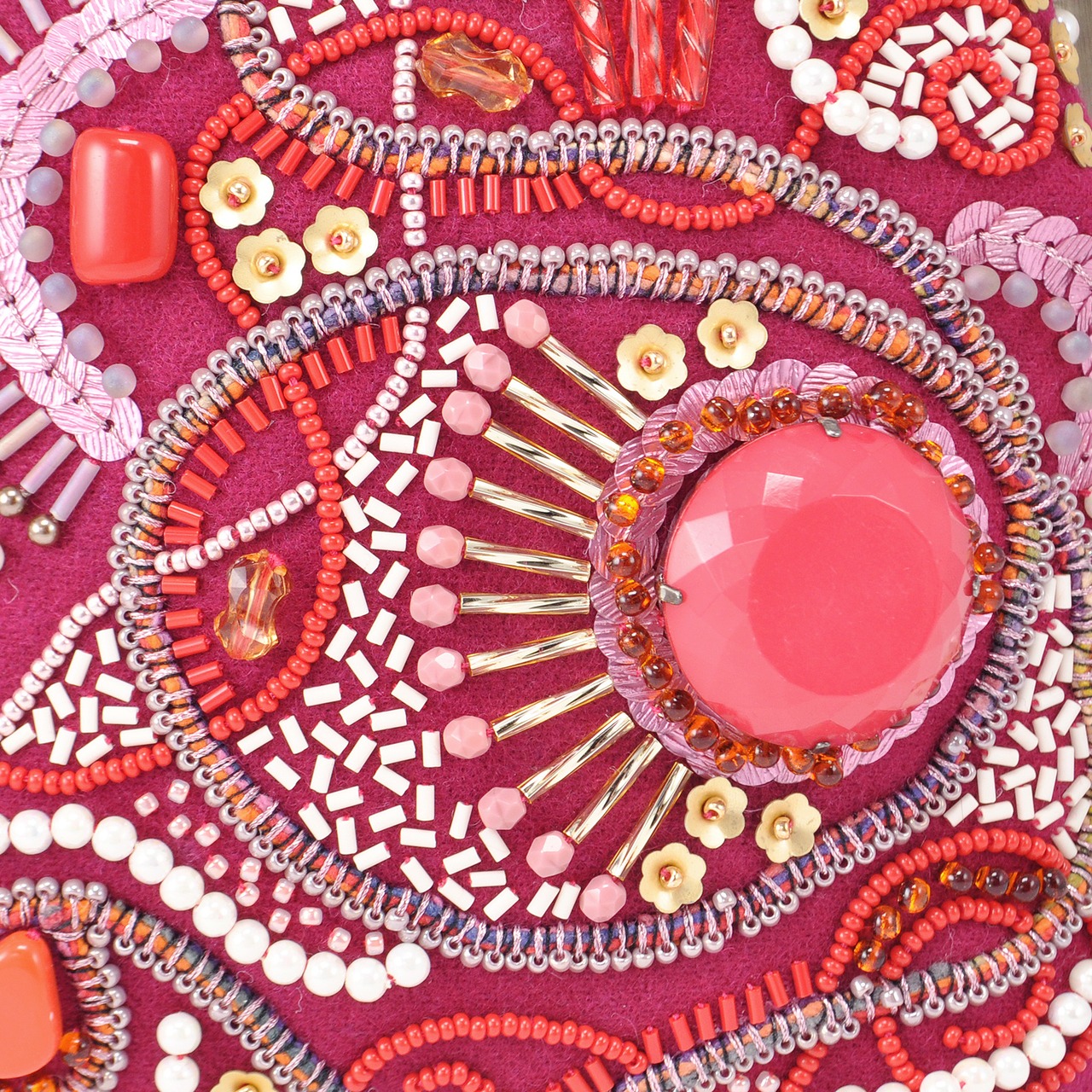 キルト芯を貼った生地にアンティークビーズやビジューなど様々な素材で細かな刺繍を施しました。