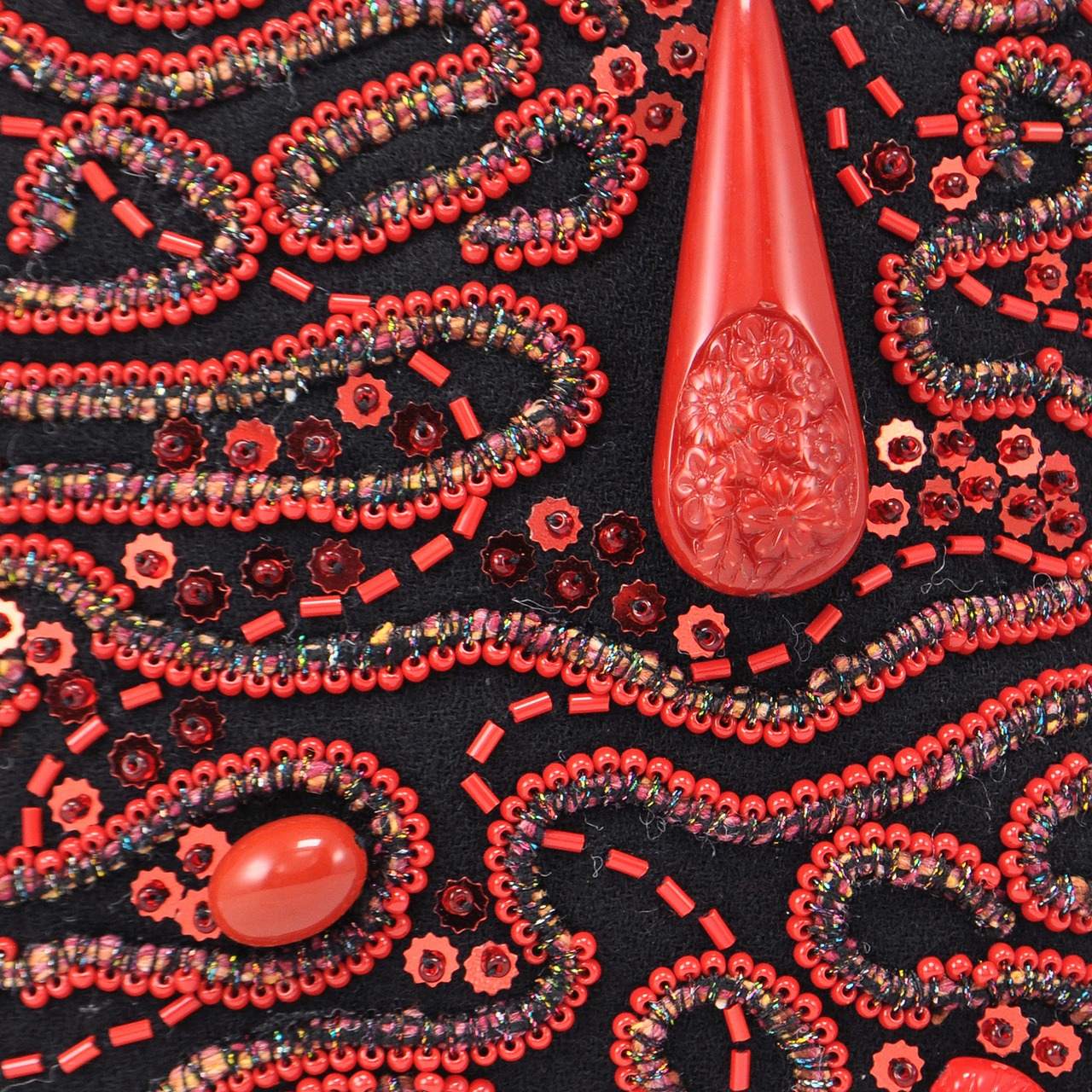キルト芯を貼った生地にアンティークビーズやビジューなど様々な素材で細かな刺繍を施しました。