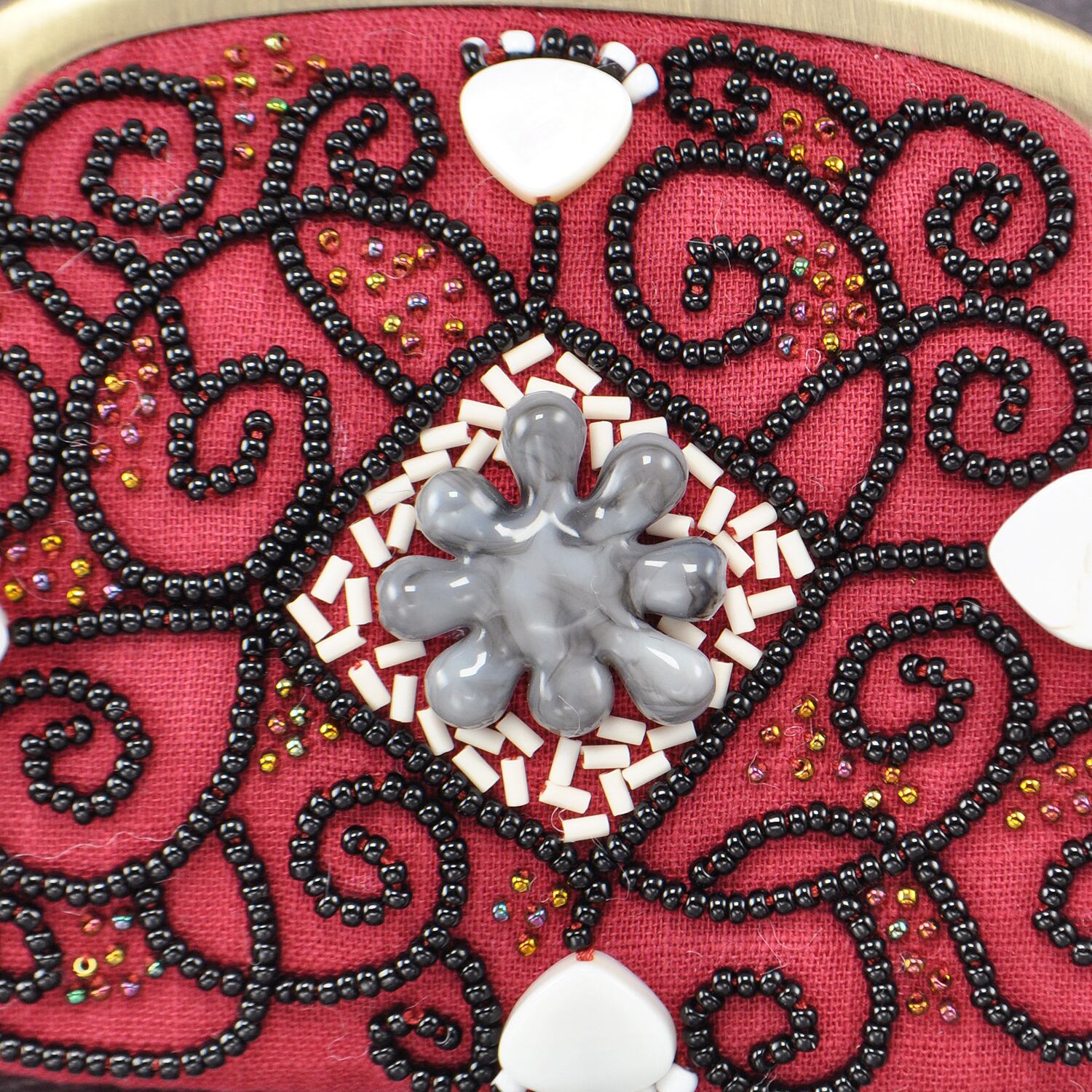 キルト芯を貼ったガーゼに糸やビーズで刺繍を施しました。