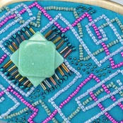 キルト芯を貼ったガーゼに糸やビーズで刺繍を施しました。