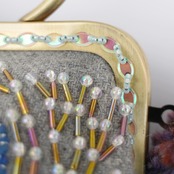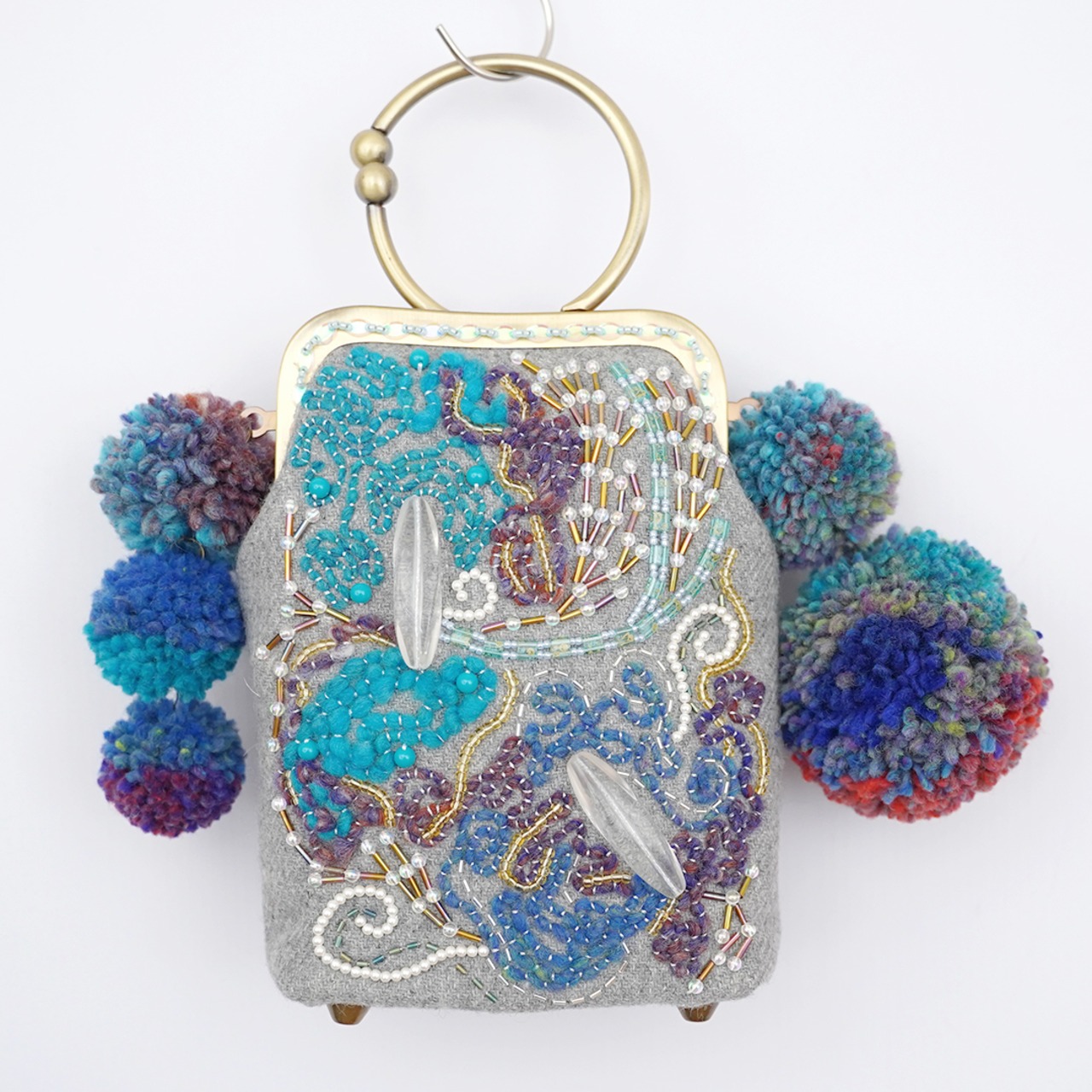 キルト芯を貼った生地にアンティークビーズや毛糸など様々な素材で細かな刺繍を施しました。