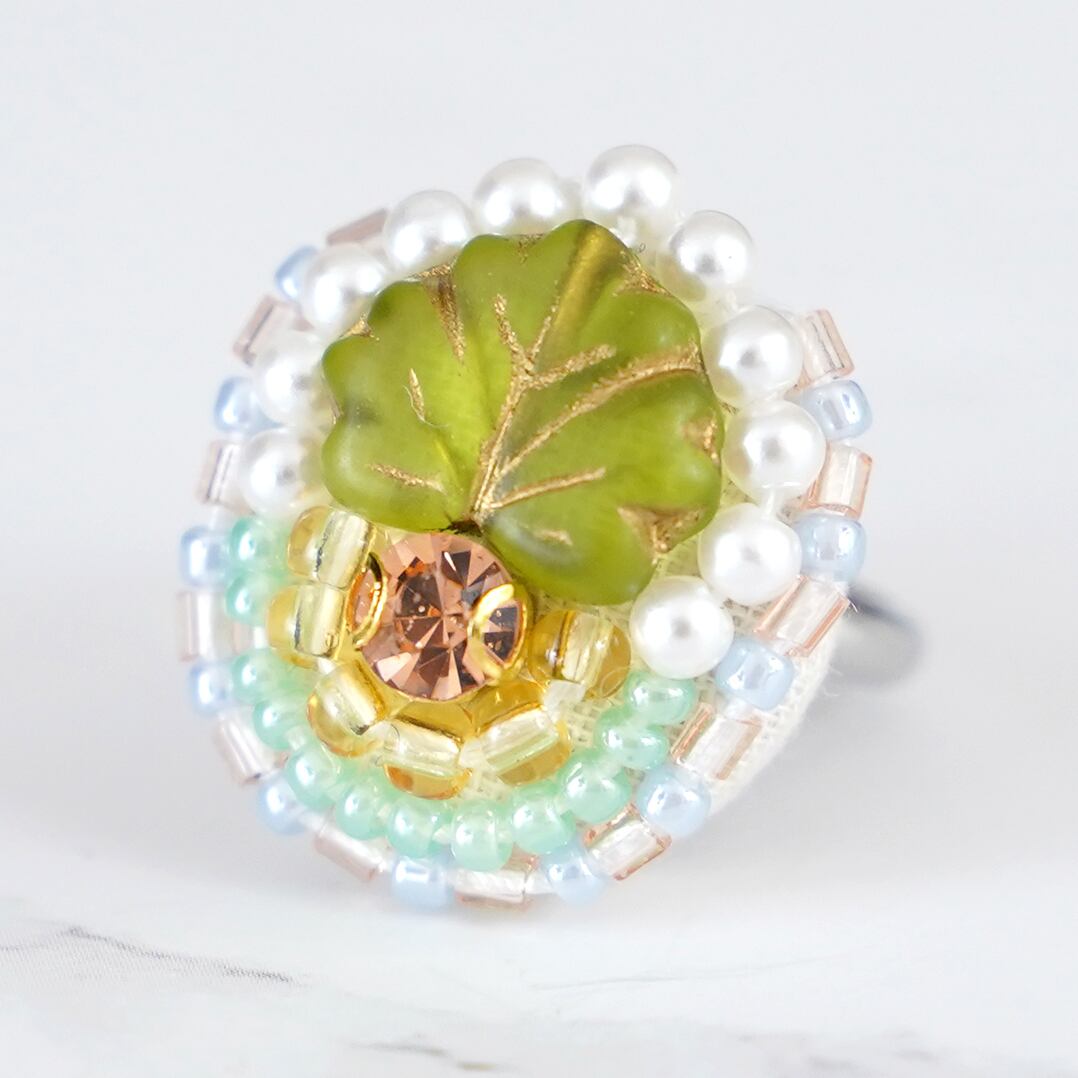 おしゃべりな指輪23 フリーサイズ ビーズ刺繍のリング リーフ ビジュー グリーン カラフル マルチカラー