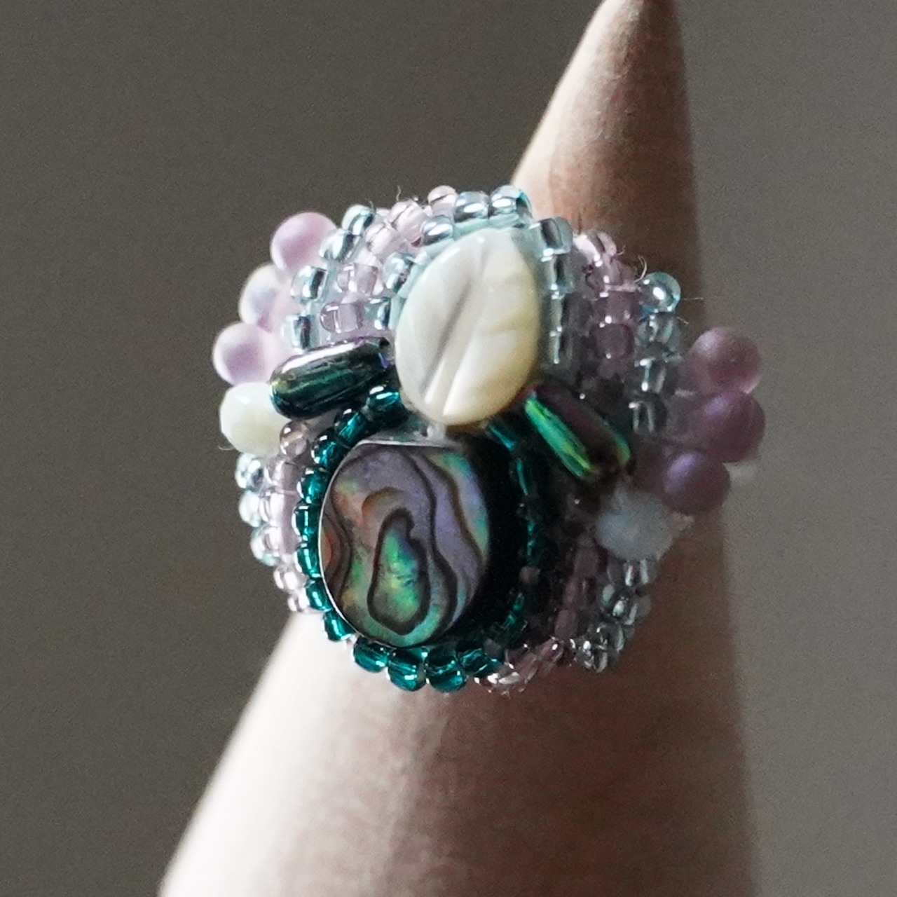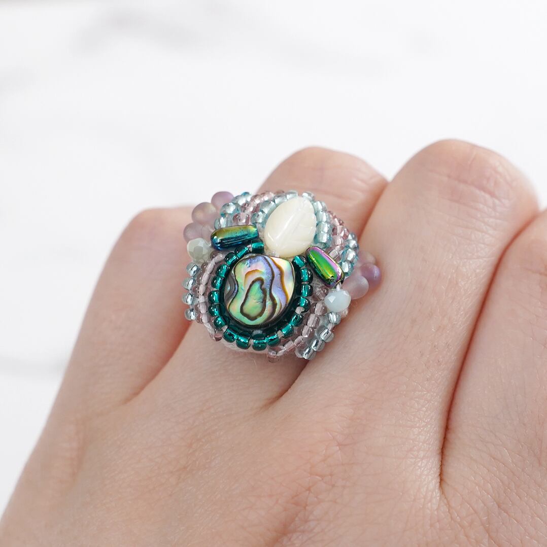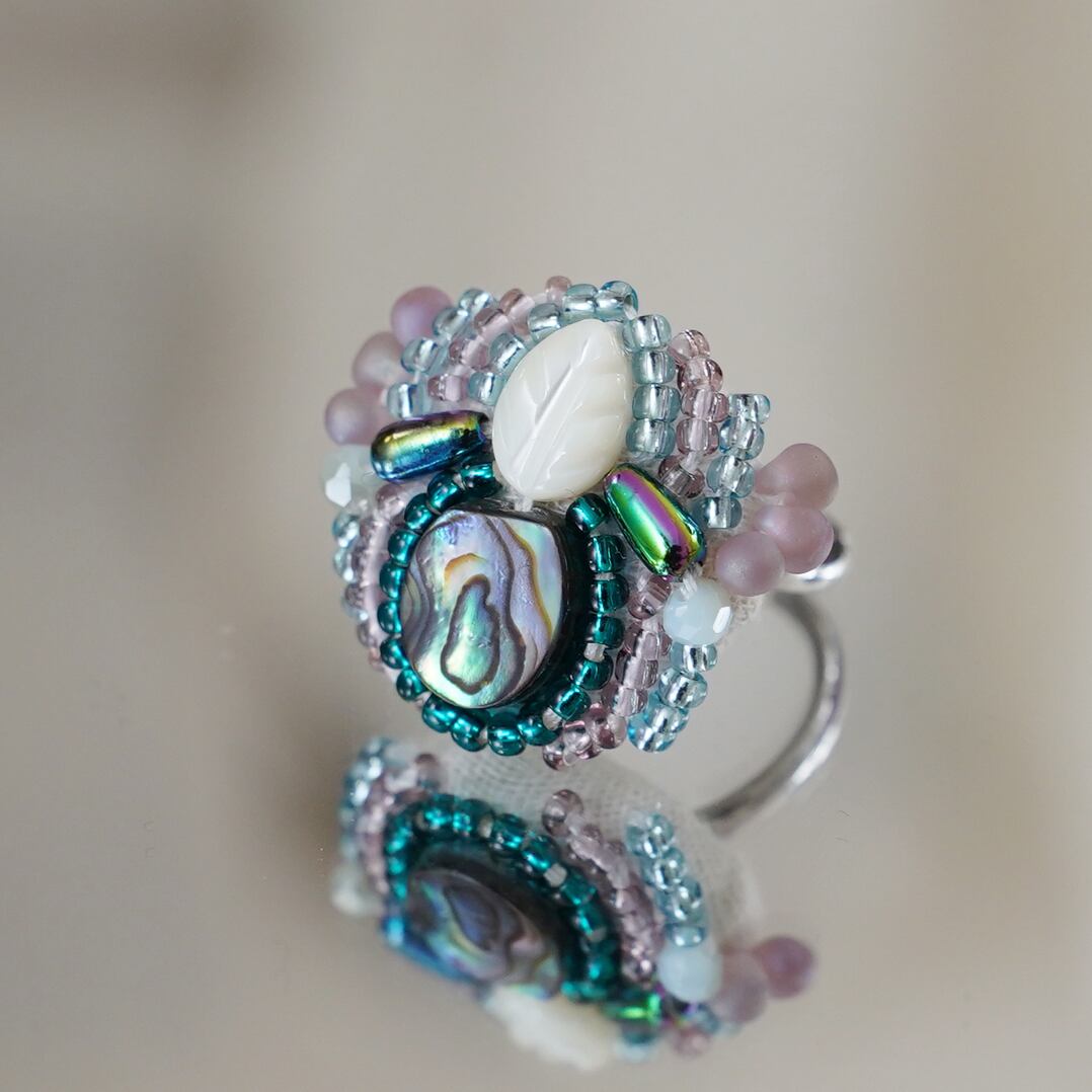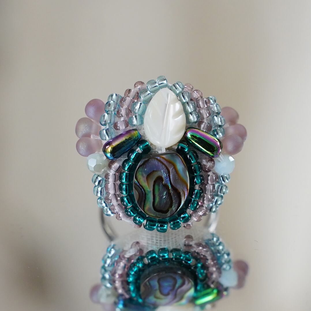 おしゃべりな指輪43 フリーサイズ ビーズ刺繍のリング リーフ アバロンシェル グリーン マルチカラー