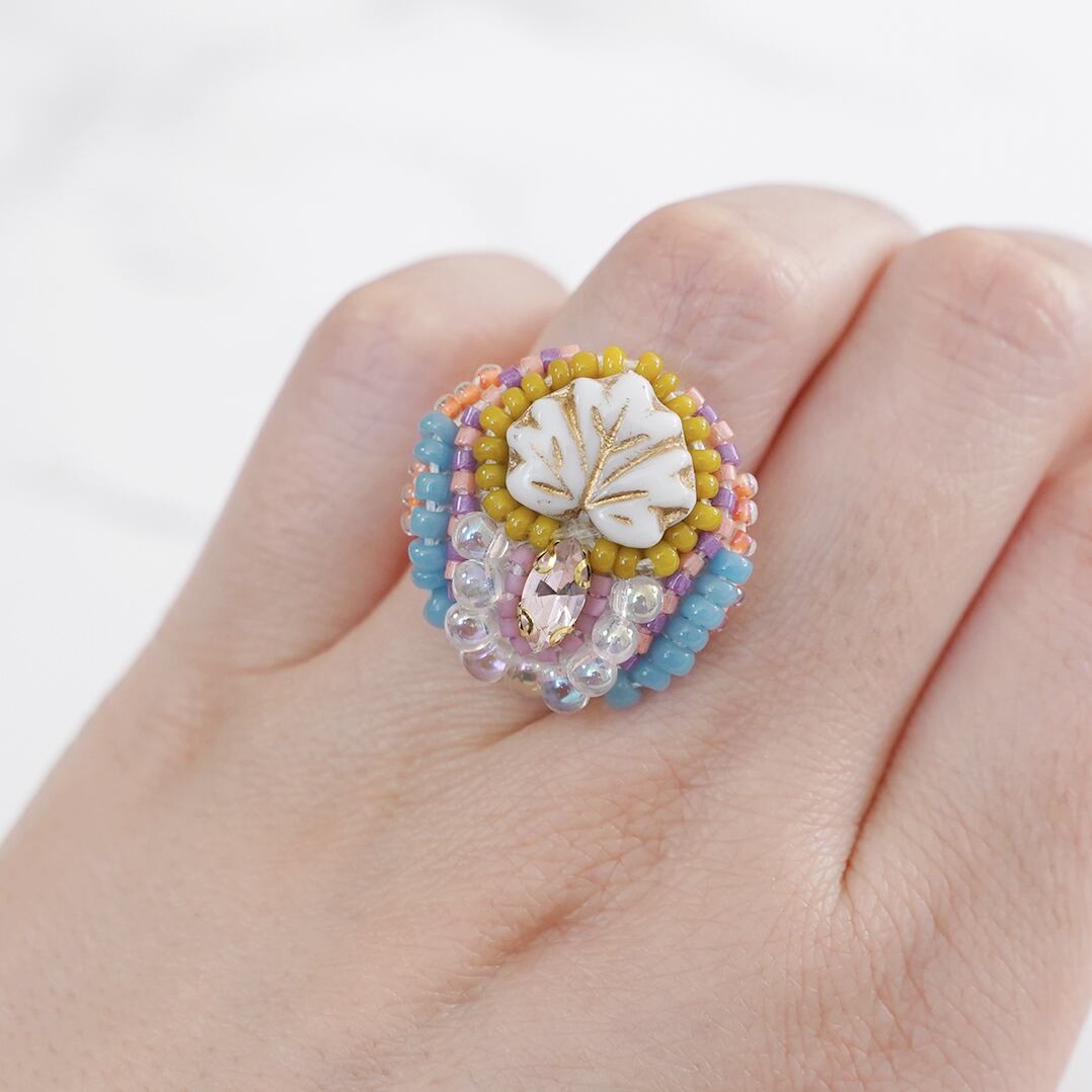 おしゃべりな指輪46 フリーサイズ ビーズ刺繍のリング リーフ ホワイト ブルー カラフル マルチカラー