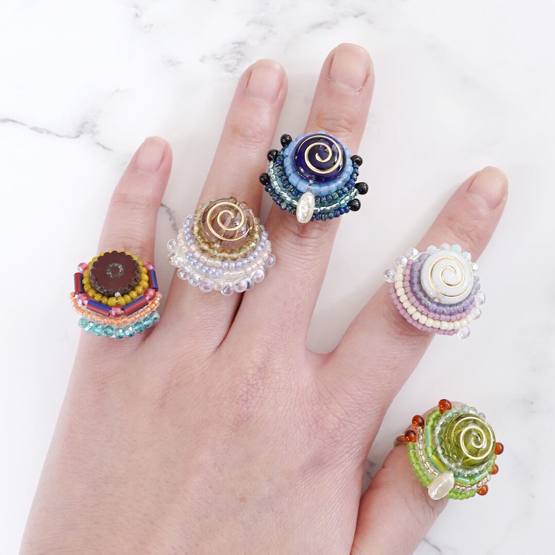 おしゃべりな指輪51 フリーサイズ ビーズ刺繍のリング まる うず ホワイト パステル マルチカラー