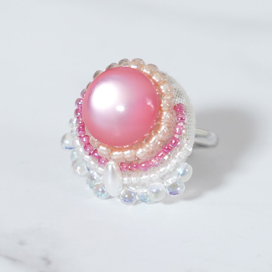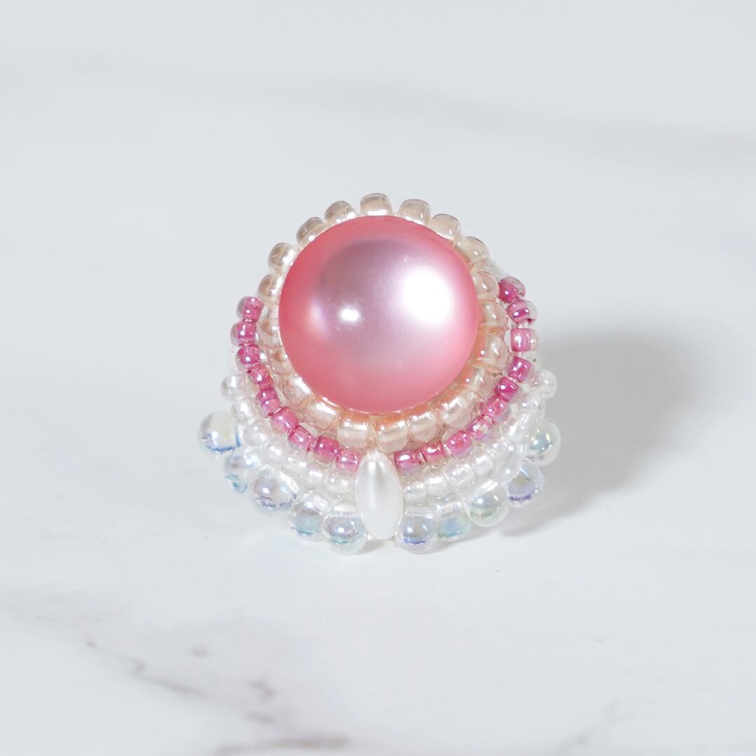 おしゃべりな指輪 63 フリーサイズ ビーズ刺繍のリング まる ピンク ホワイト マルチカラー