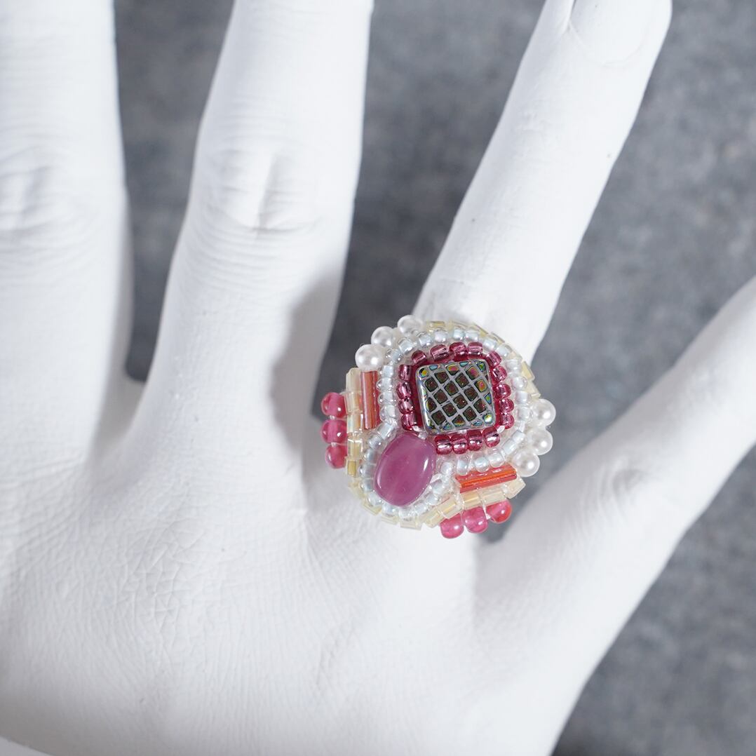 おしゃべりな指輪73 フリーサイズ ビーズ刺繍のリング ピンク スクエア マルチカラー