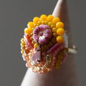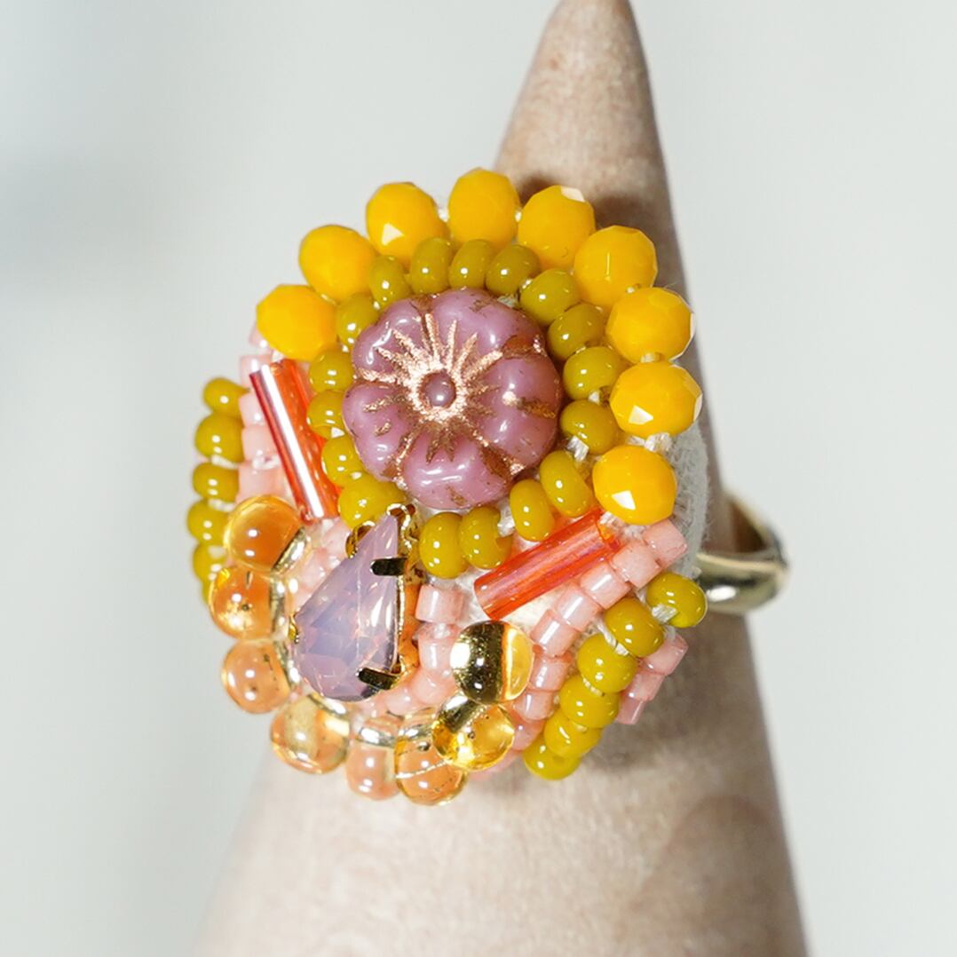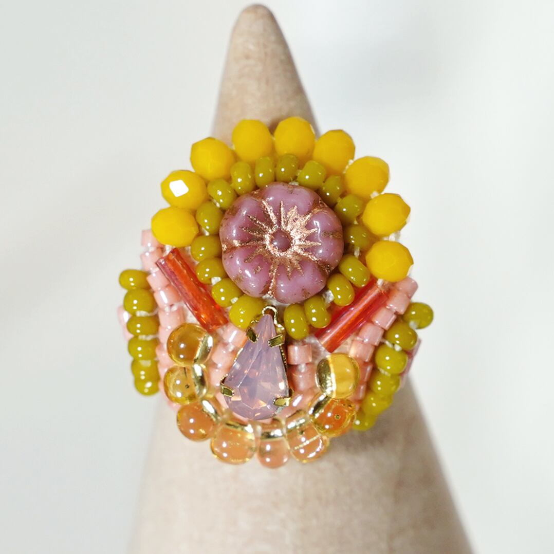 おしゃべりな指輪91 フリーサイズ ビーズ刺繍のリング 花 イエロー ピンク