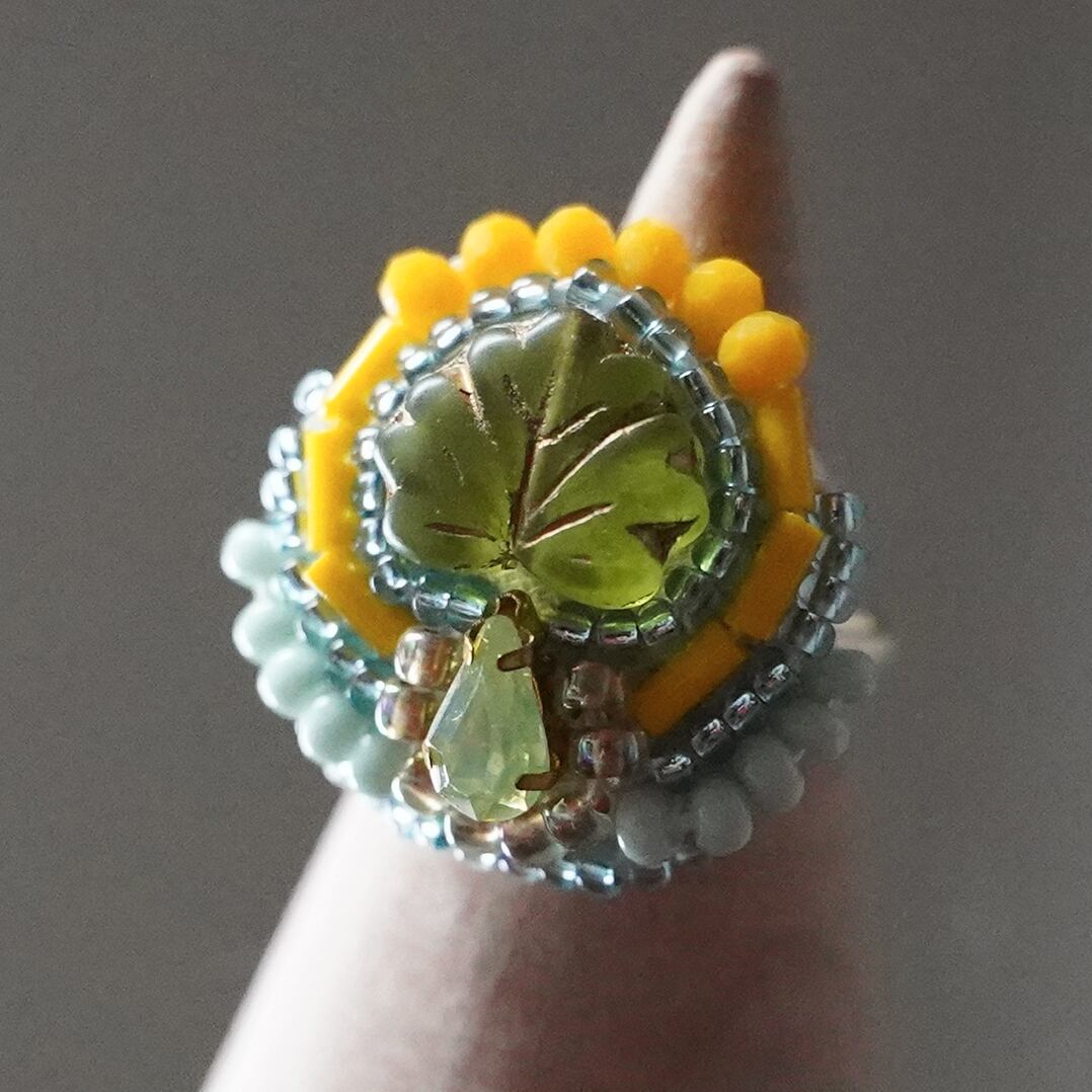 おしゃべりな指輪92 フリーサイズ ビーズ刺繍のリング リーフ イエロー グリーン