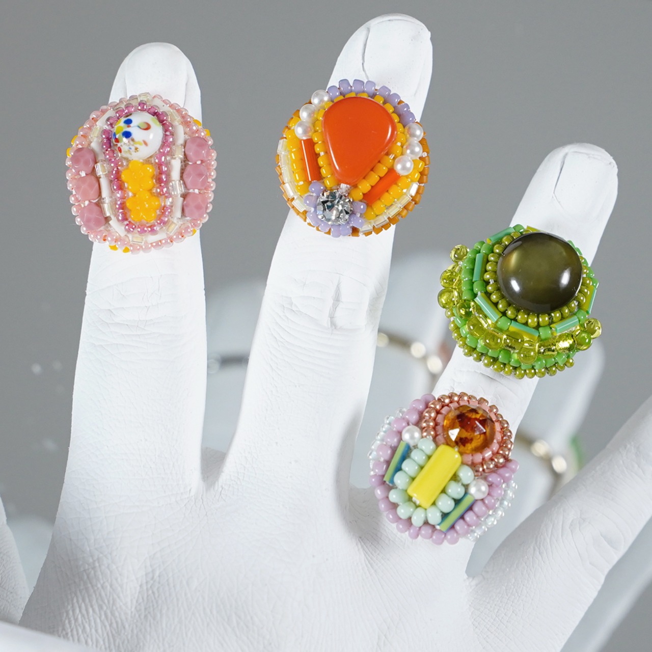 おゃべりな指輪100 フリーサイズ ビーズ刺繍のリング オレンジ マルチカラー 個性的