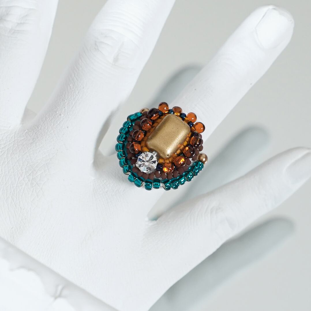 おゃべりな指輪113 フリーサイズ ビーズ刺繍のリング カラフル ゴールド おおぶりリング マルチカラー