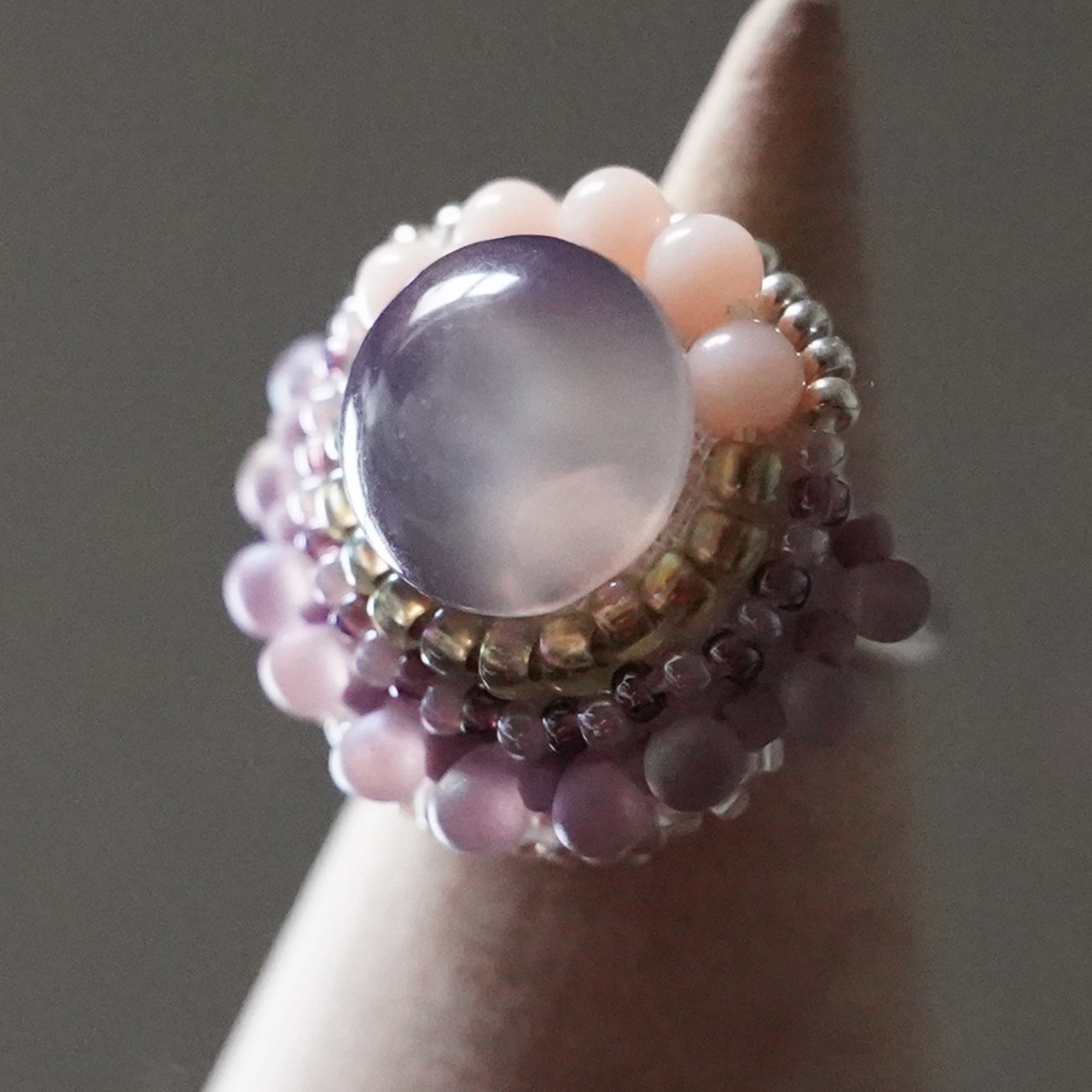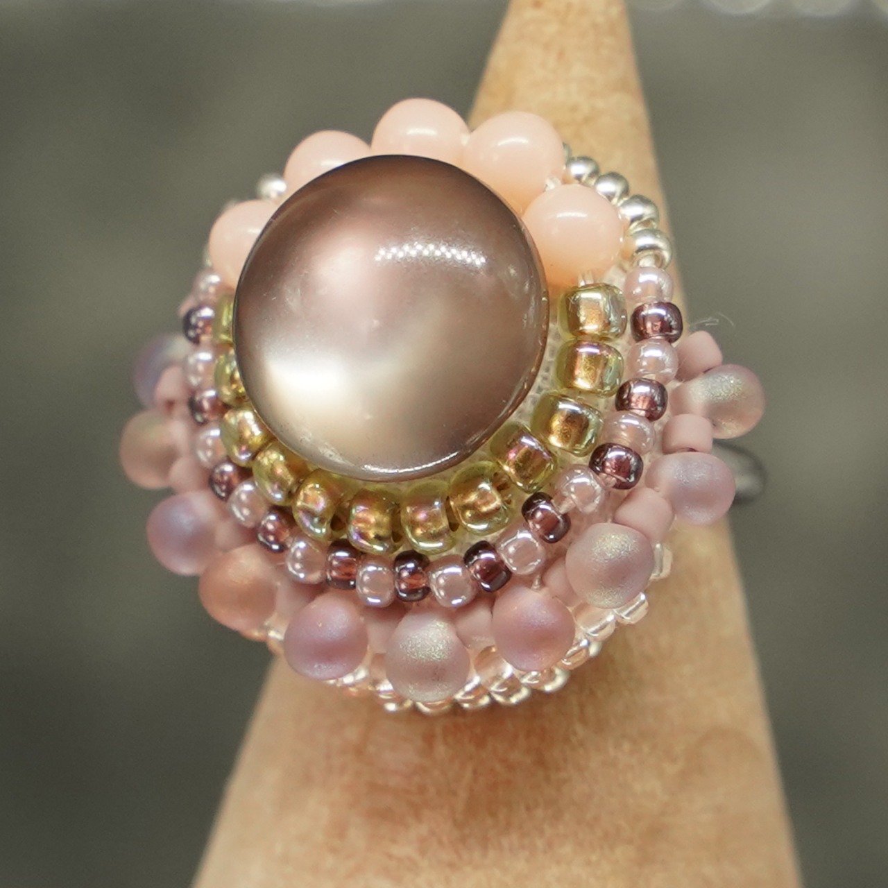 スカーフ留めにも おしゃべりな指輪147 フリーサイズ ビーズ刺繍のリング グレイッシュ おおぶりリング
