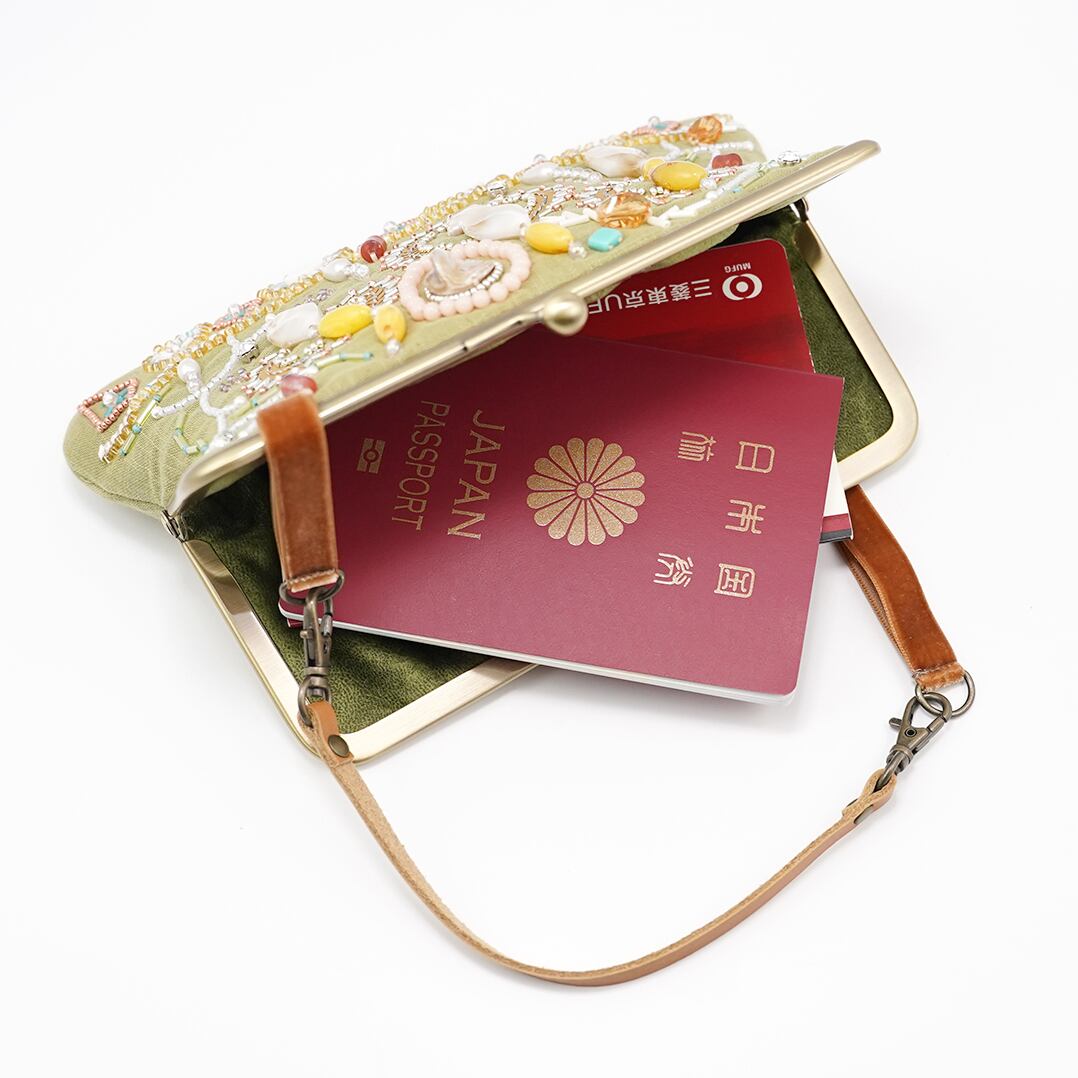 持ち手の付いた四角い口金のがま口です。通帳やパスポートを入れるのに丁度いいサイズです。もちろんアクセサリーや化粧品なども入ります。