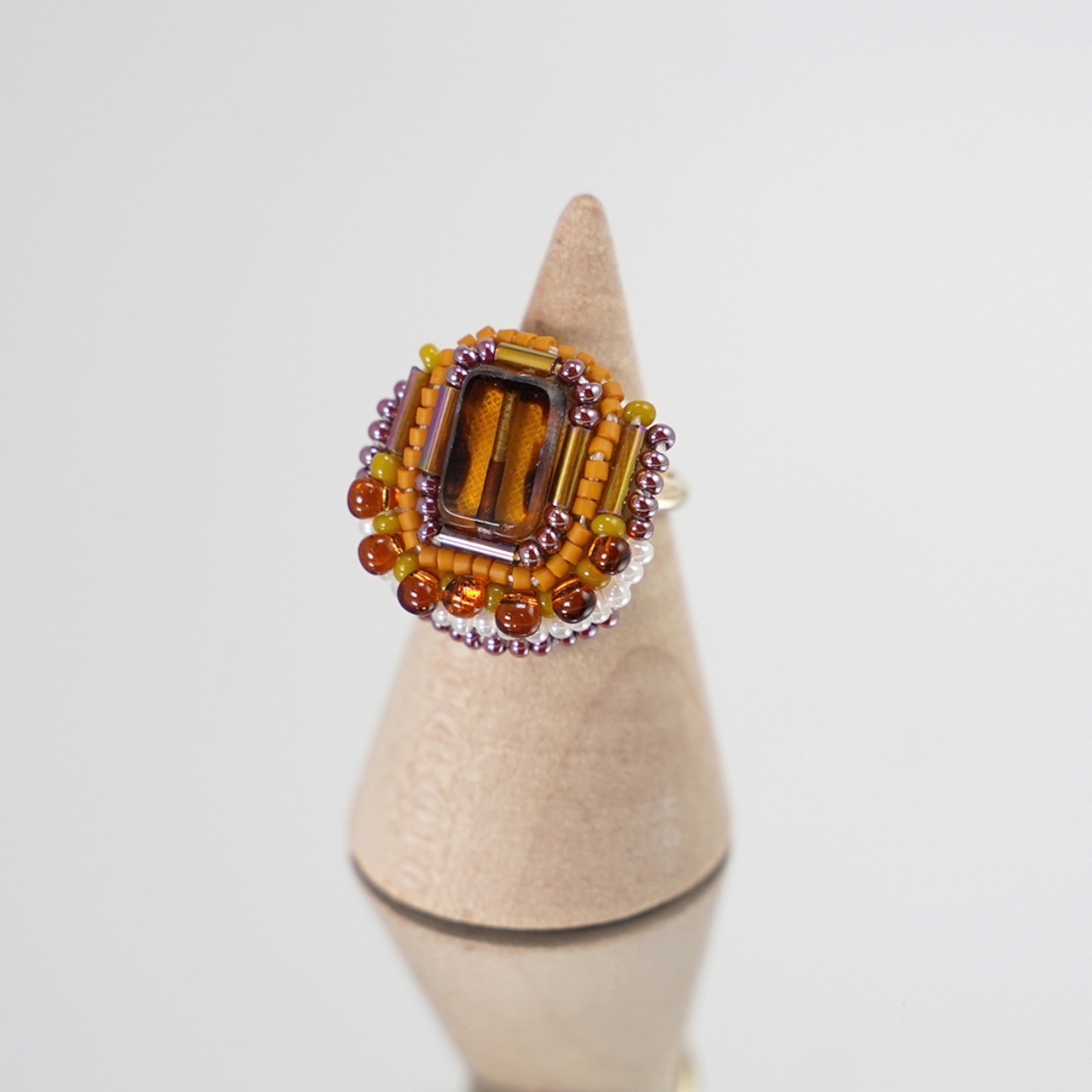 スカーフ留めにも おしゃべりな指輪182 フリーサイズ ビーズ刺繍のリング オレンジ ブラウン おおぶりリング